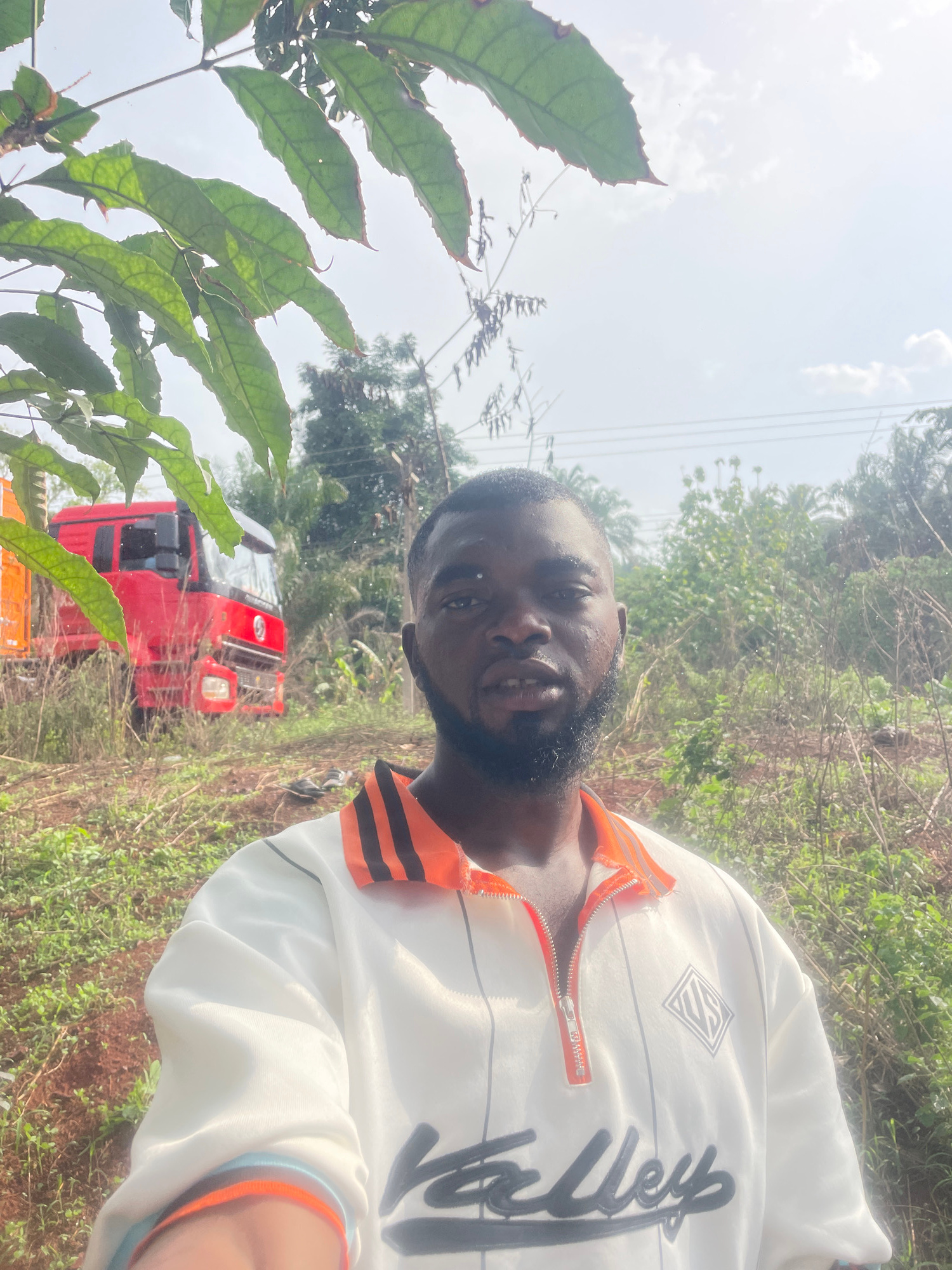 A man is standing in an overgrown field in Ogbe, Nigeria. He is wearing a white jacket with orange accents and the word "Valley" written in black script. Behind him, a red and yellow vehicle is visibl…read more