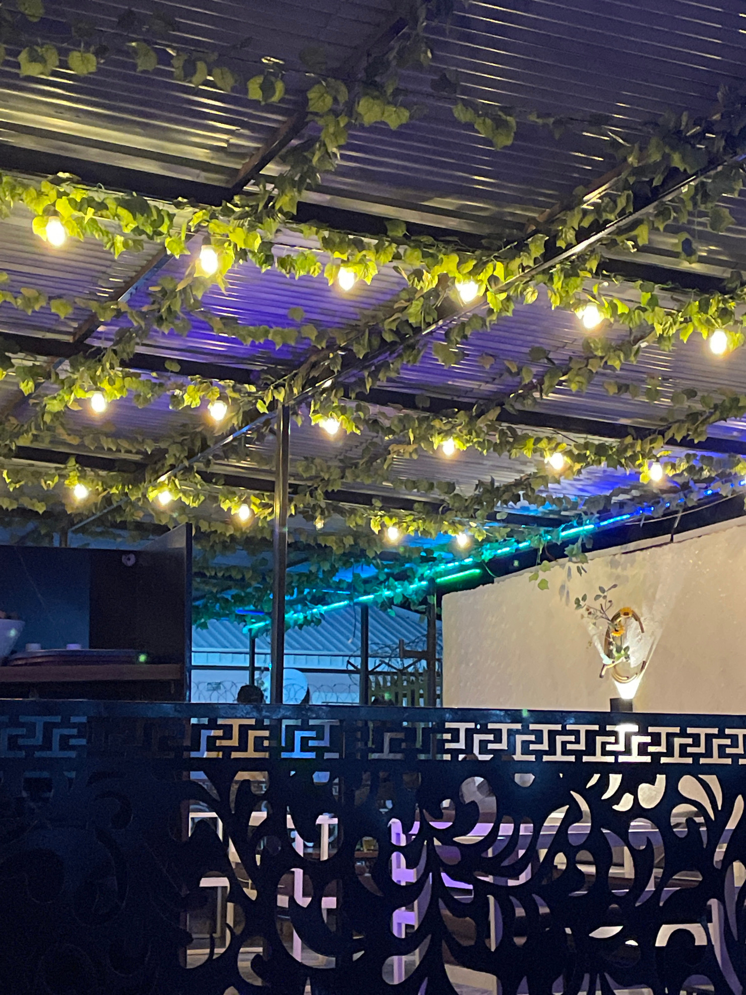The image shows an outdoor setting, likely a restaurant or bar, located in Jos, Nigeria. A corrugated metal wall on the left is adorned with green vines and small lights, creating a decorative effect.…read more