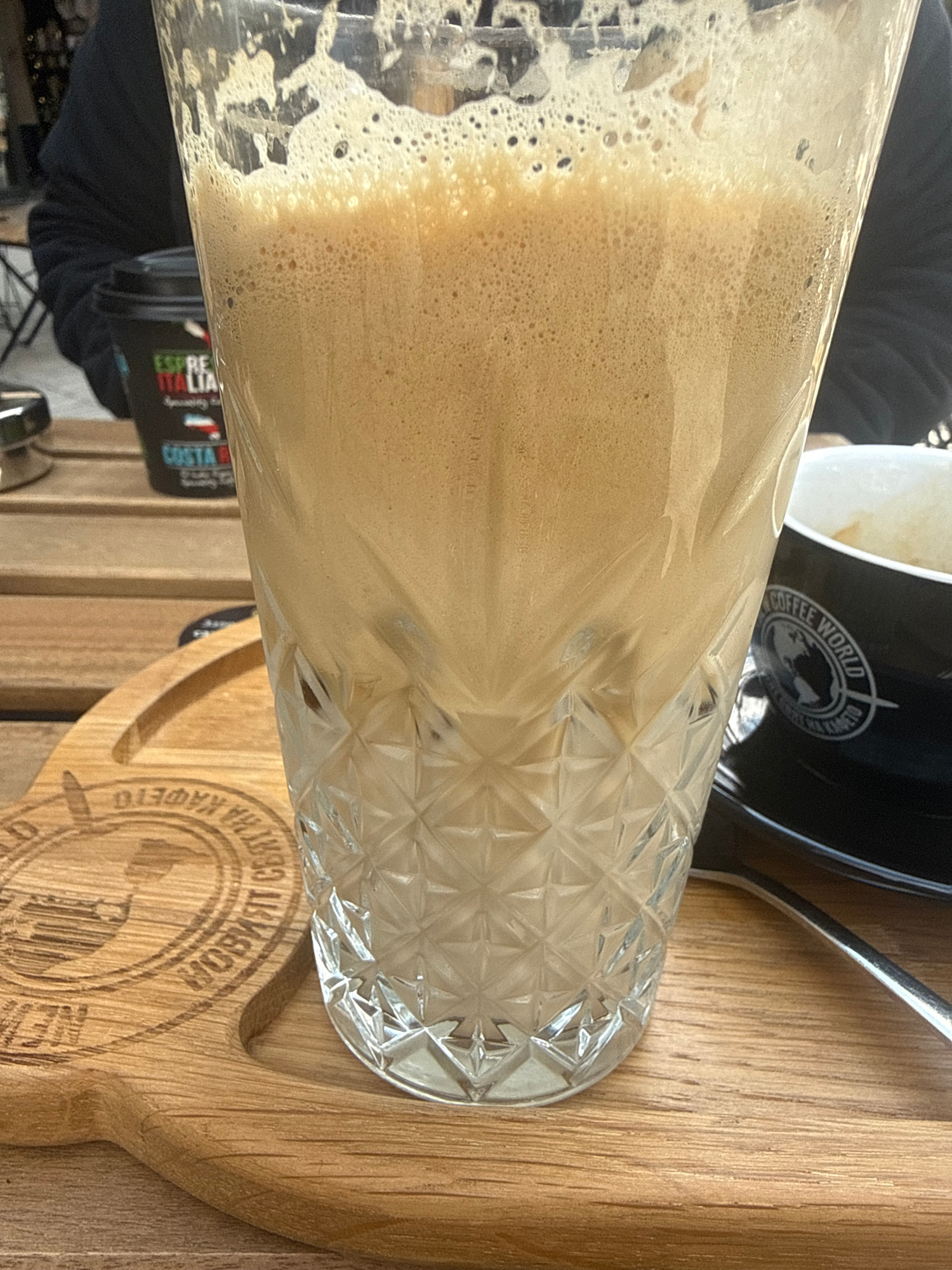 The image shows a glass of iced coffee or similar beverage with a thick foam layer, placed on a wooden serving board that appears to be custom-made with coffee-related text in Bulgarian. The wood grai…read more