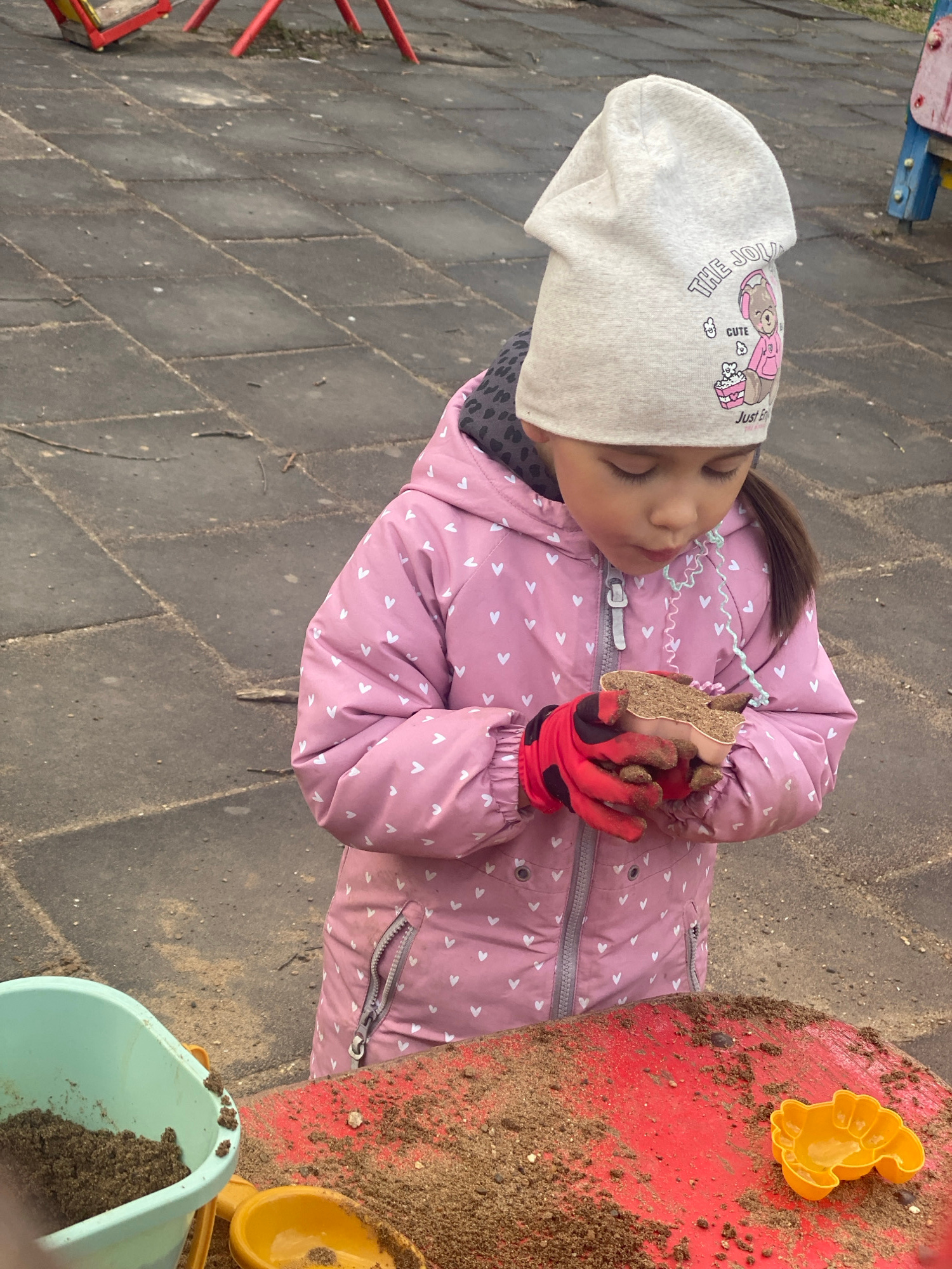 This outdoor, eye-level shot in Chaikovsky, Russia, captures a young child intently engaged in sand play. The child, likely a girl, is dressed in warm attire, suggesting cool weather. She wears a ligh…read more