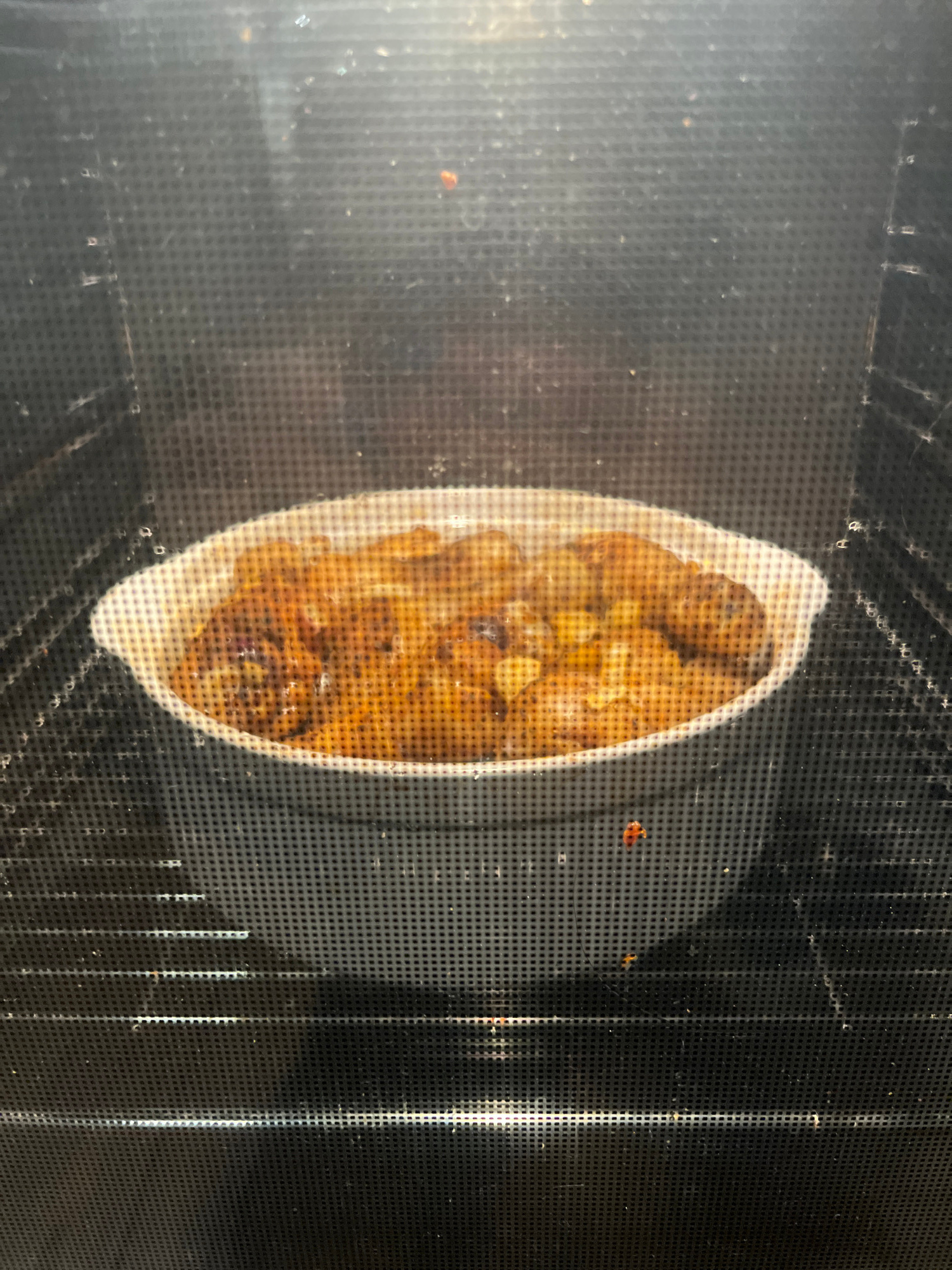 A long, oval, white ceramic casserole dish containing cooked food is sitting inside a black oven. The oven door has a perforated metal surface, obscuring the view of the food. The food appears to be a…read more