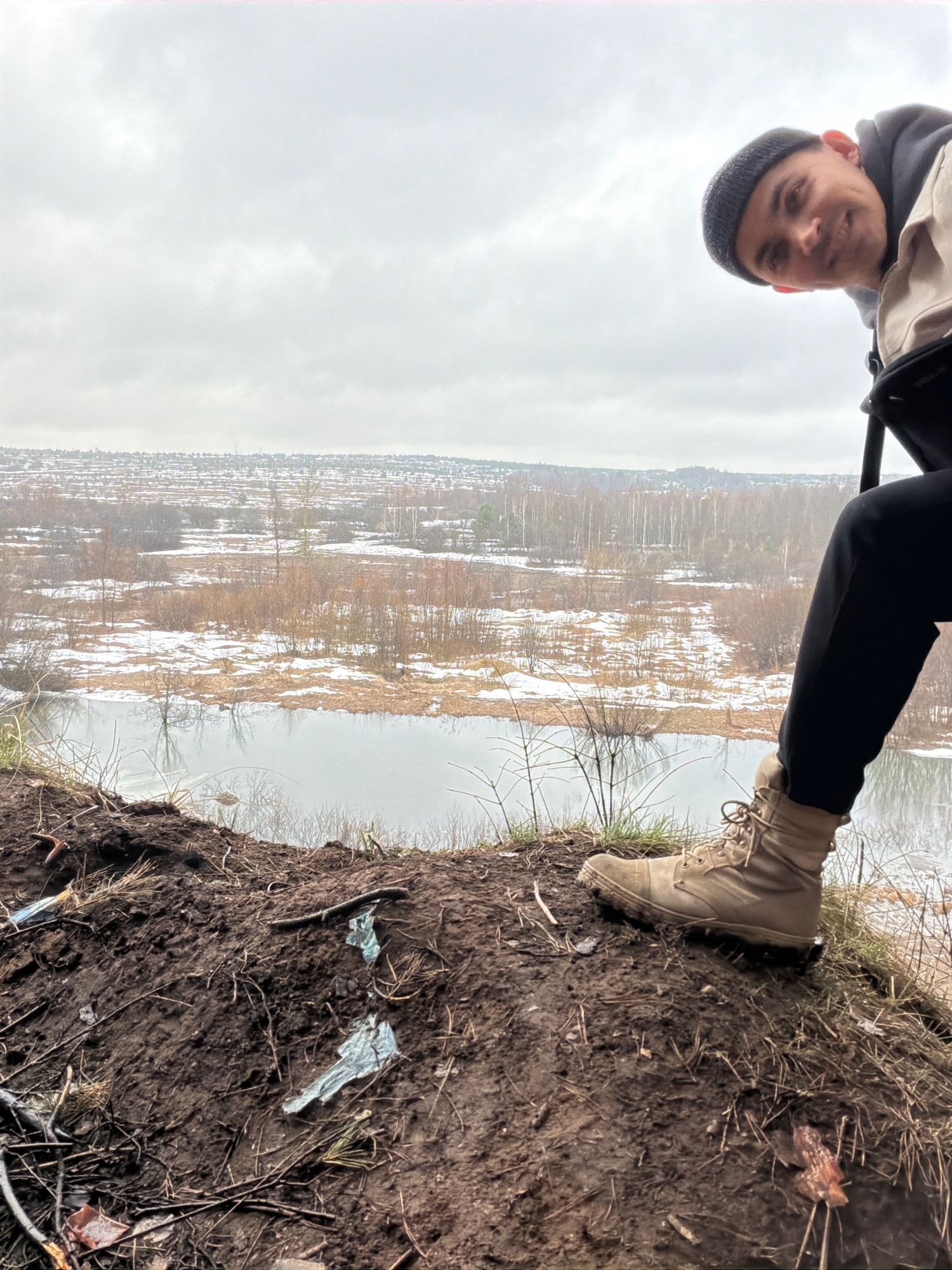 The image shows a person standing on the edge of a muddy bank overlooking a body of water, likely a river or a pond, in what appears to be a wooded area. The person, dressed in dark clothing, is weari…read more