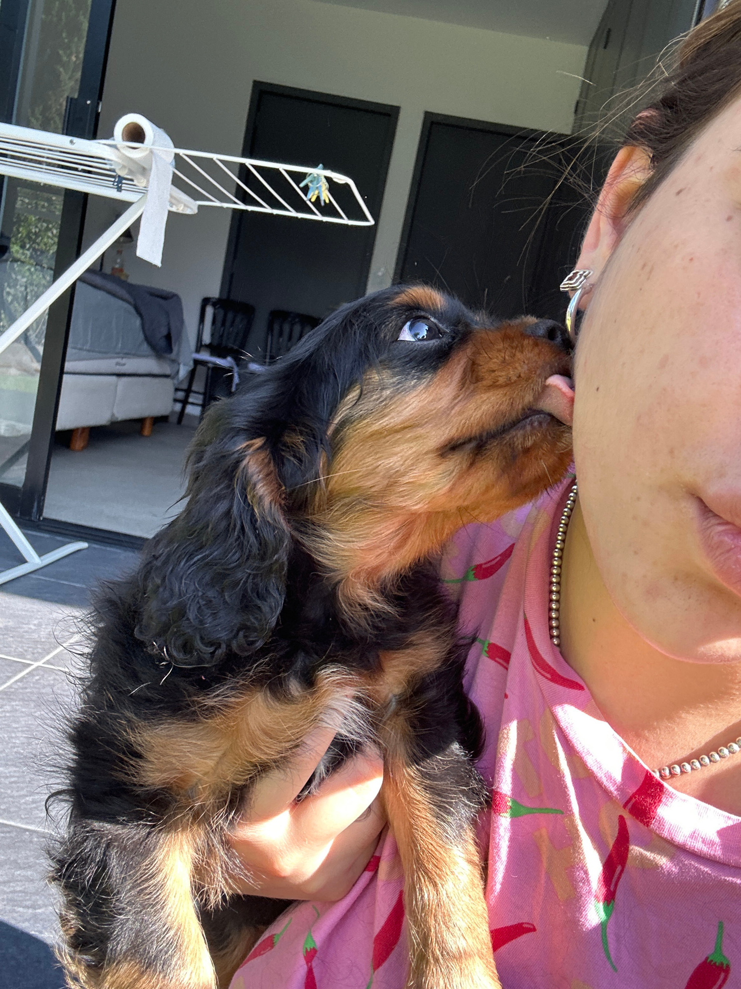 A close-up, angled shot features a person holding a Cavalier King Charles Spaniel puppy. The puppy is licking the person's face. The person is wearing a pink shirt patterned with red chili peppers and…read more