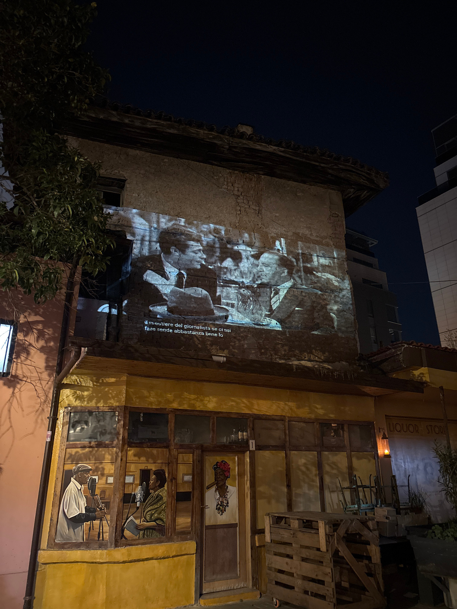 At night in Tirana, Albania, a weathered building displays an outdoor projection of a black-and-white image featuring a man in a hat, possibly a depiction of journalistic activity. The projection incl…read more