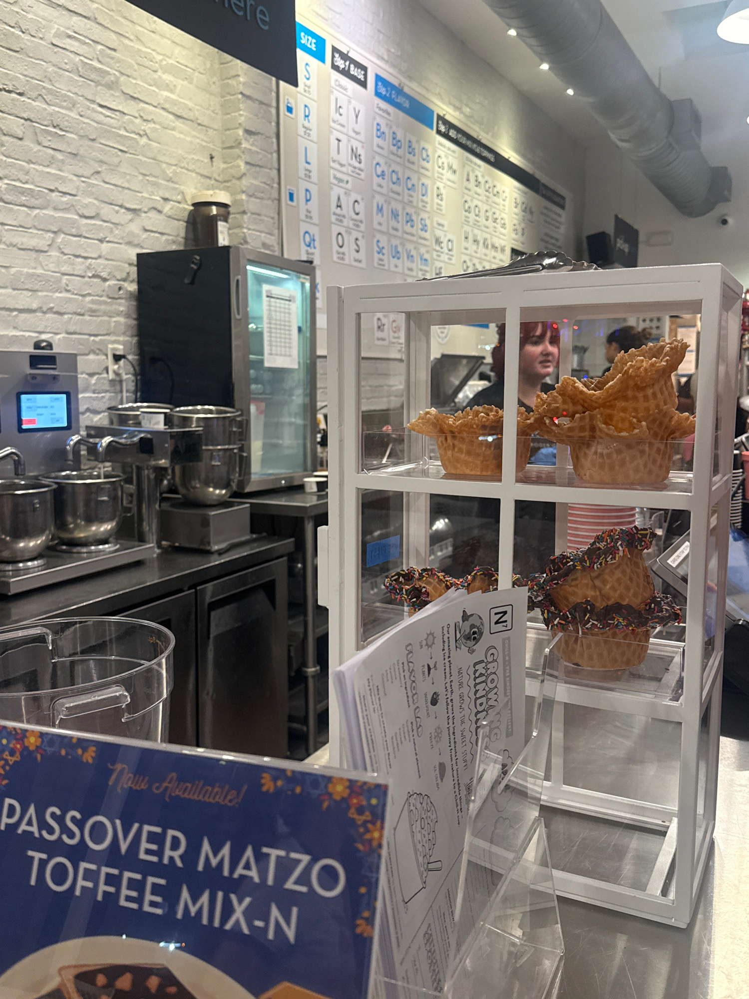 The image shows the interior of a dessert shop in Aventura, Florida, United States. A white metal display case contains decorated waffle cones. A customer is visible behind the case. In front of the d…read more