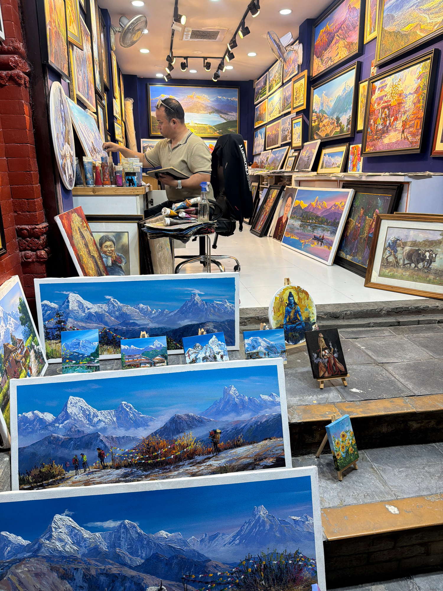 The image shows a man in a shop in Pokhara, Nepal, surrounded by framed paintings. The man wears a light brown shirt and glasses and is examining one of the paintings. Paintings are displayed on the w…read more