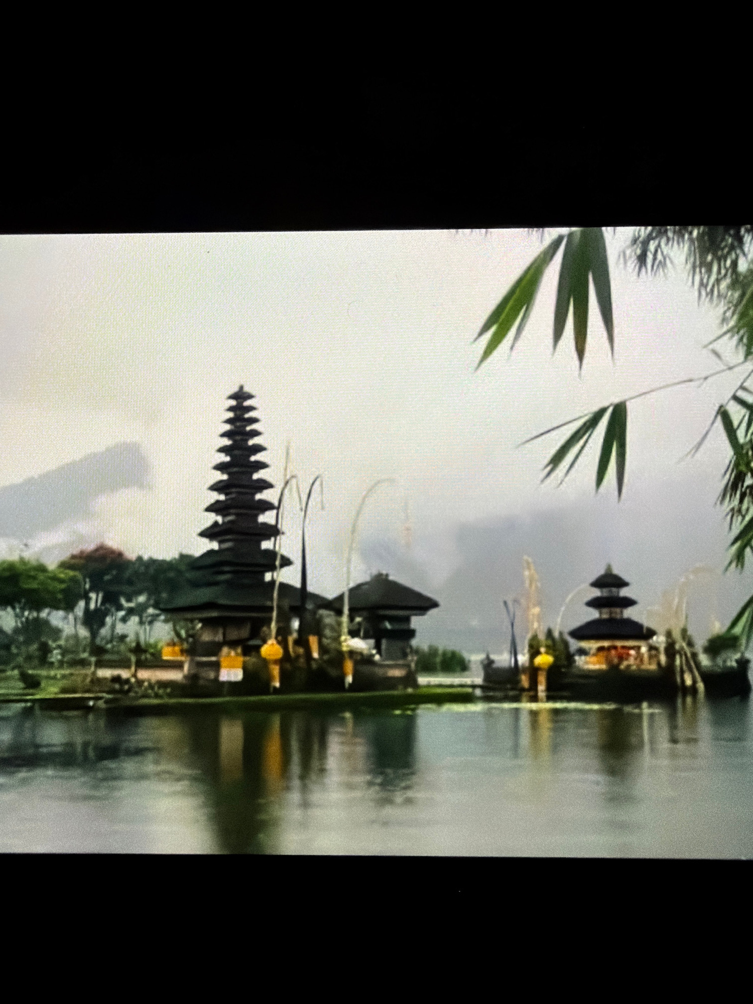 The image shows a landscape in Ungasan, Indonesia. It features two multi-tiered Balinese temples reflected in a body of water. Green foliage and bamboo are visible in the foreground and middle ground.…read more