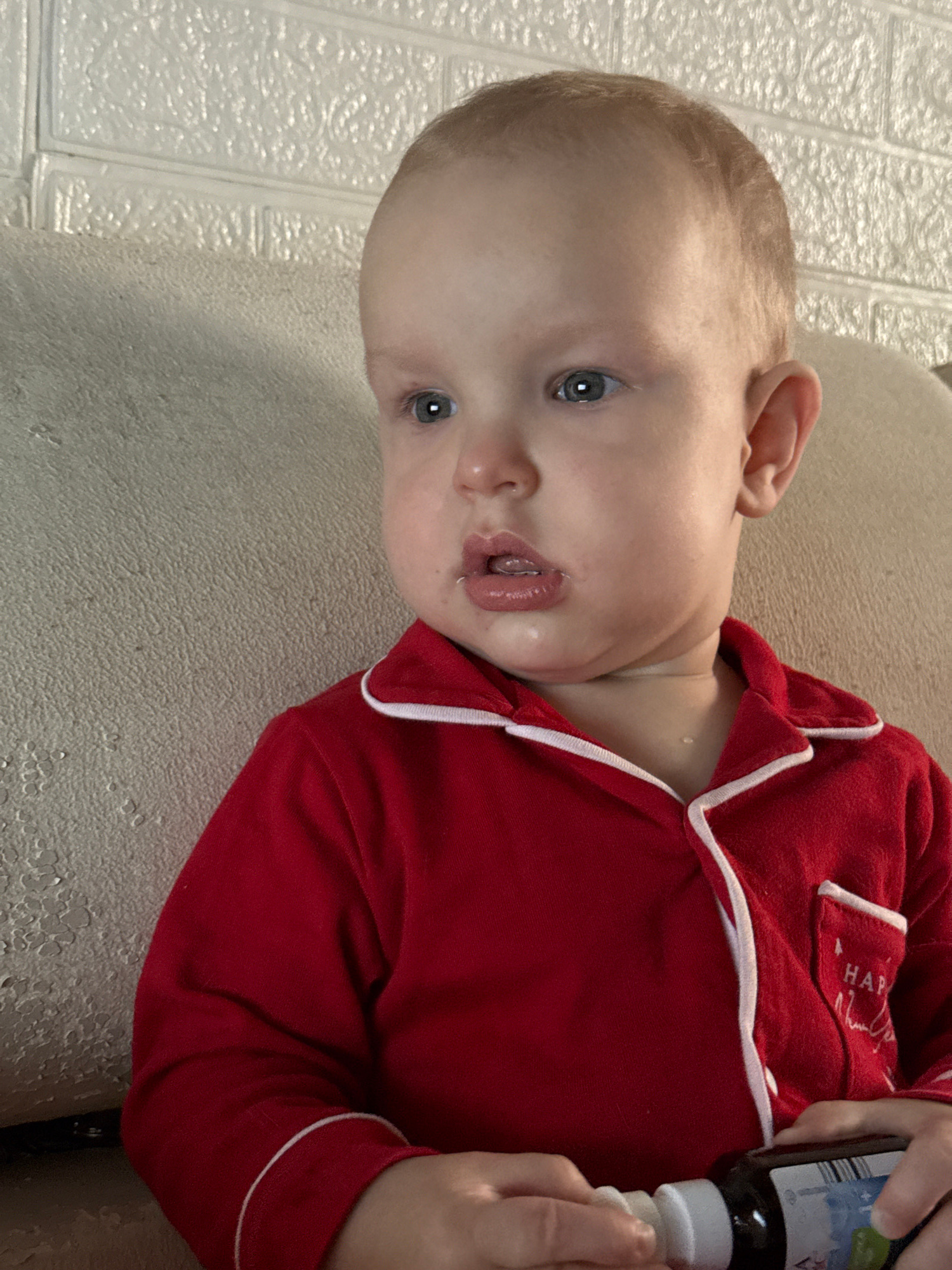 A baby with fair skin and blue eyes, wearing a red pajama top with white trim, is lying on a tan-colored surface. The baby is holding a dark bottle with a white lid in their right hand. The background…read more