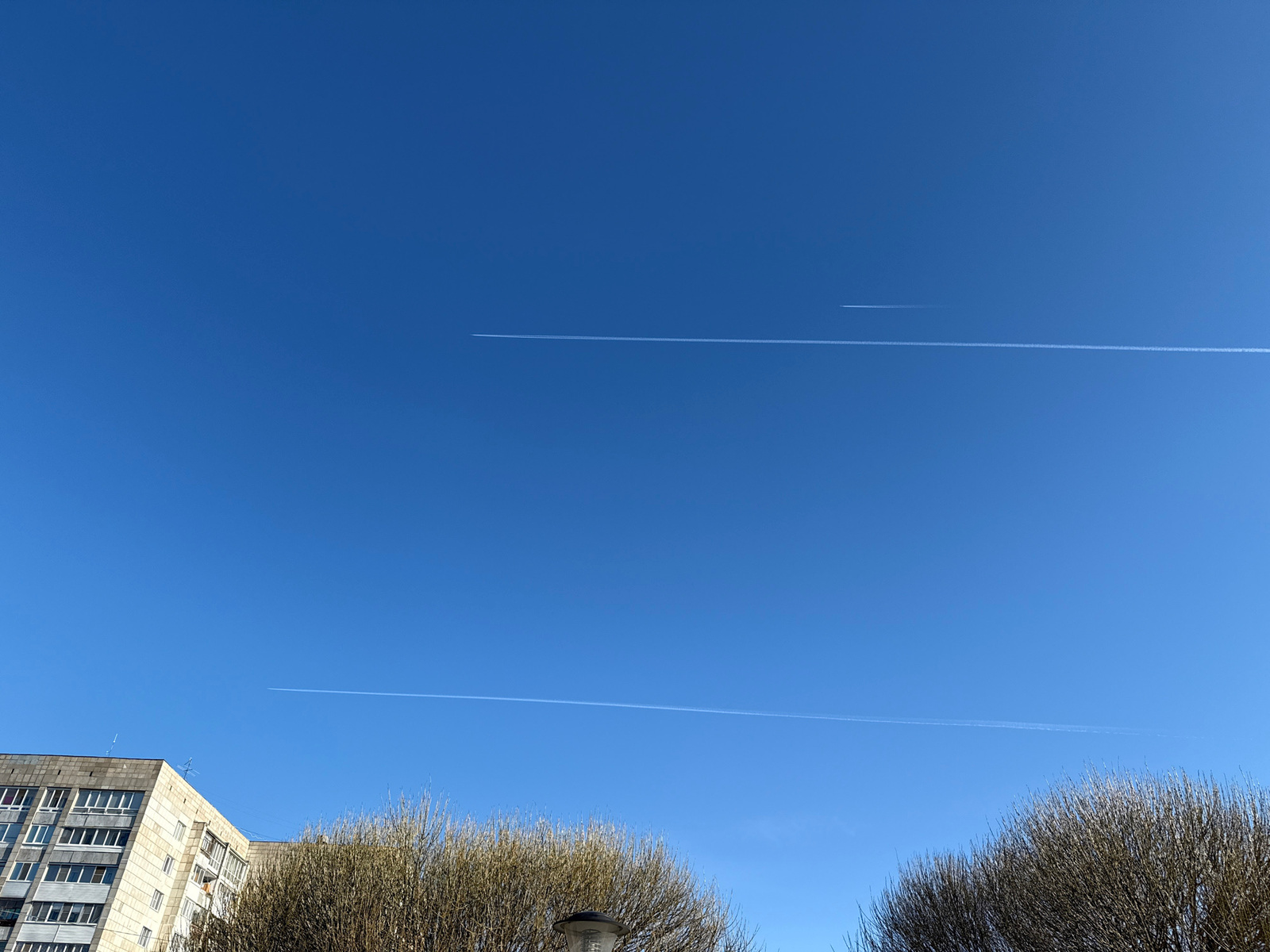 The image captures a bright blue sky above a city, likely in the Unknown region, given the unknown city information. Two parallel contrails cut across the sky, indicating the passage of aircraft at hi…read more