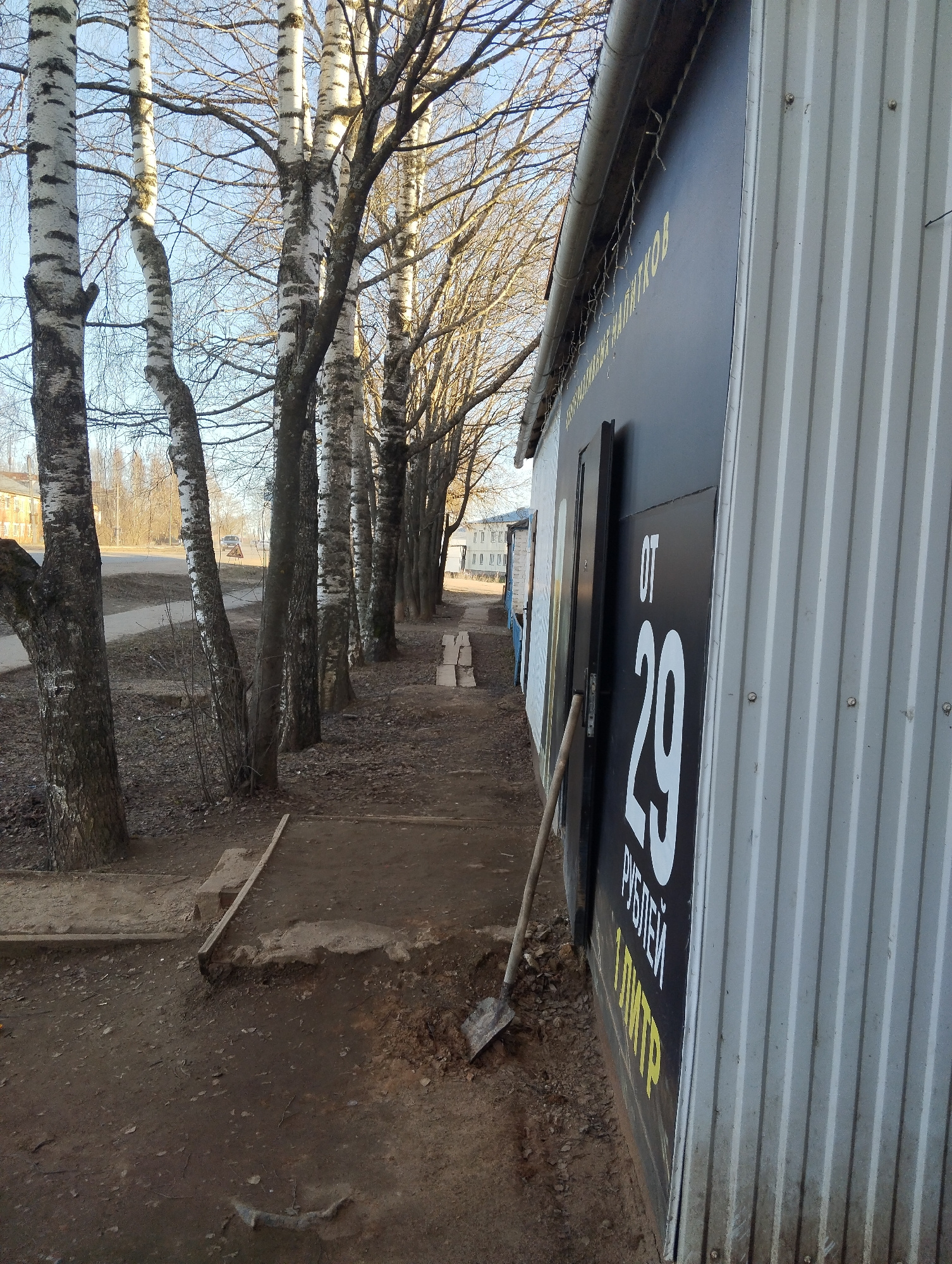 This image depicts a street scene in Krasnogorskoye, Russia, characterized by a row of birch trees lining a dirt path next to a commercial building. The weather is clear and sunny, with a bright blue…read more