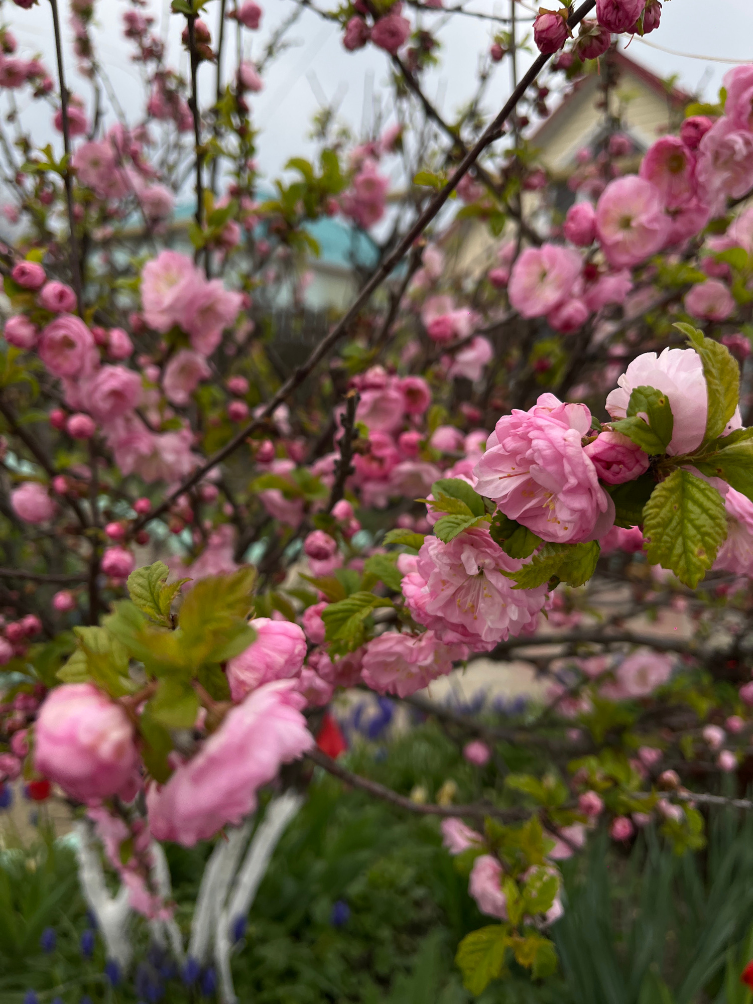 The image captures a close-up, vertically oriented view of a deciduous shrub or tree adorned with numerous pink, double-petaled blossoms. The flowers are the dominant subject, appearing in various sta…read more