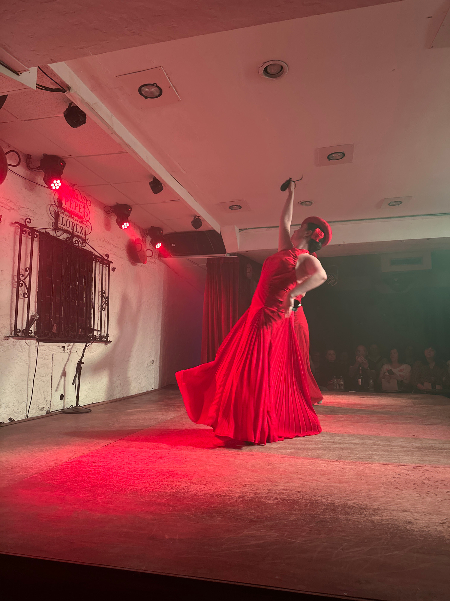 A person in a red dress dances on a stage in a dimly lit room. The person has dark hair and wears a red hat with a red flower on it. They extend their left arm towards the left wall, while their right…read more