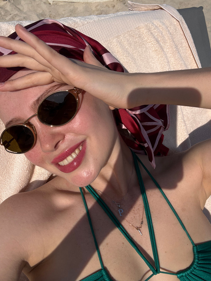 An overhead, sunlit close-up depicts a female individual reclining outdoors on a light-colored, textured towel. She is wearing a dark green halter-neck bikini top, round, gold-framed Miu Miu sunglasse…read more