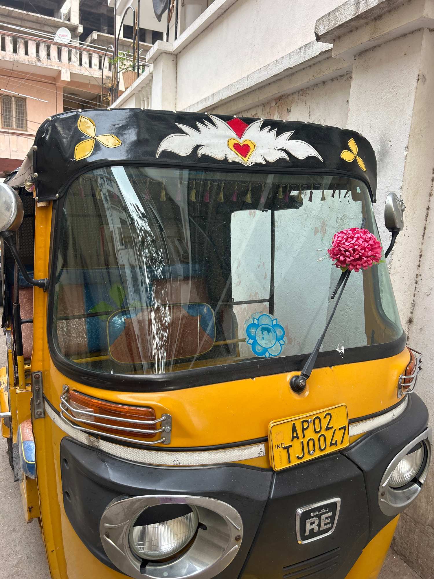 The image depicts the front of a yellow and black Bajaj RE auto rickshaw, a common mode of transport in India. The vehicle has an Andhra Pradesh registration plate, reading "AP02 TJ 0047". The windshiβ¦read more