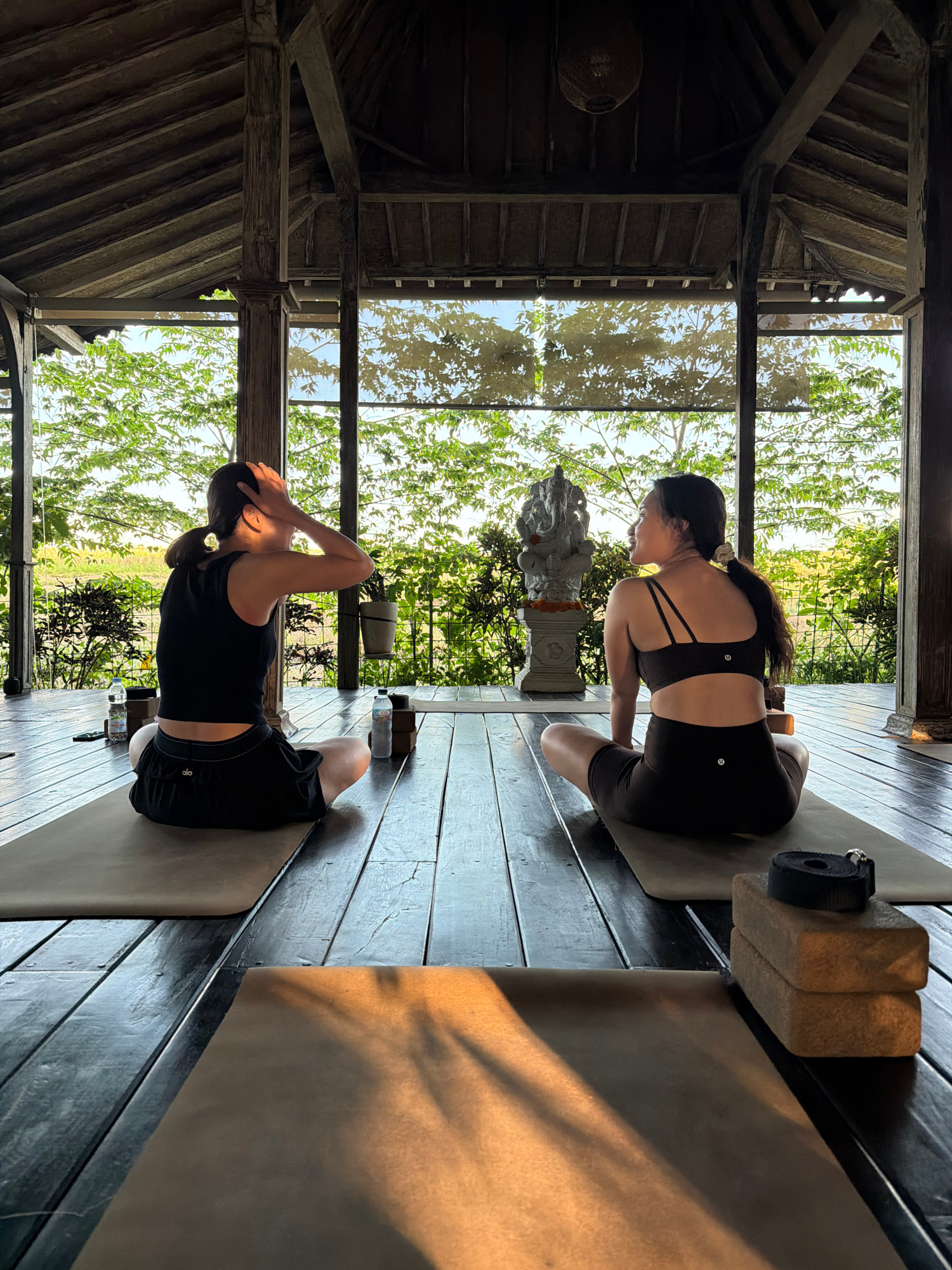 Two women are practicing yoga in a wooden building with an open view to the outside. The building has a complex wooden roof structure and is surrounded by trees and plants. One woman is wearing a dark…read more