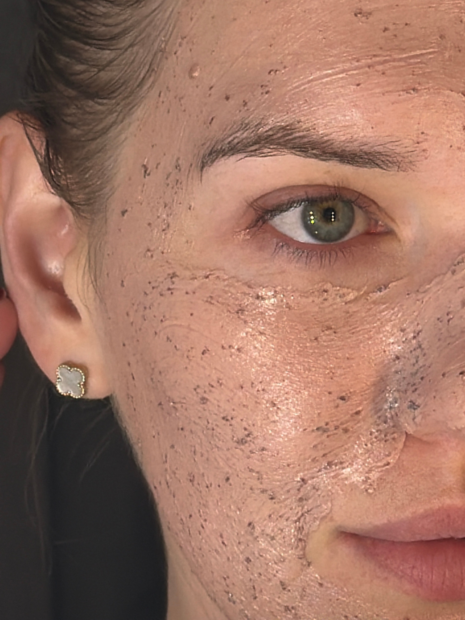 A close-up image captures a person's face covered with what appears to be a cosmetic or facial treatment. The skin is light-toned, and the treatment has a beige hue speckled with darker, possibly exfo…read more