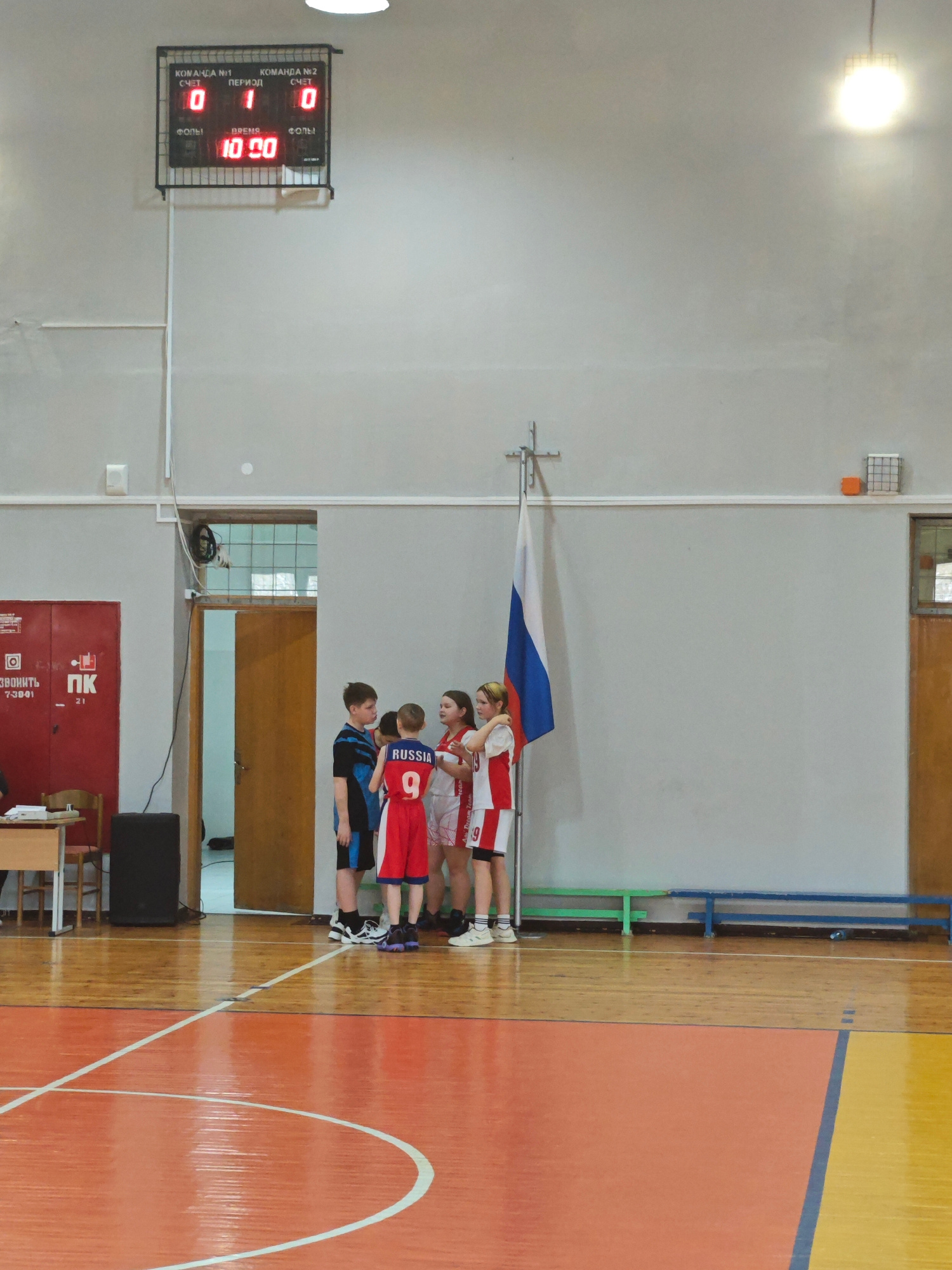 In the town of Markovskii, Russia, a group of young athletes gathers inside a gymnasium. Five individuals, dressed in basketball attire, stand in a huddle near a Russian flag mounted on a stand. One p…read more