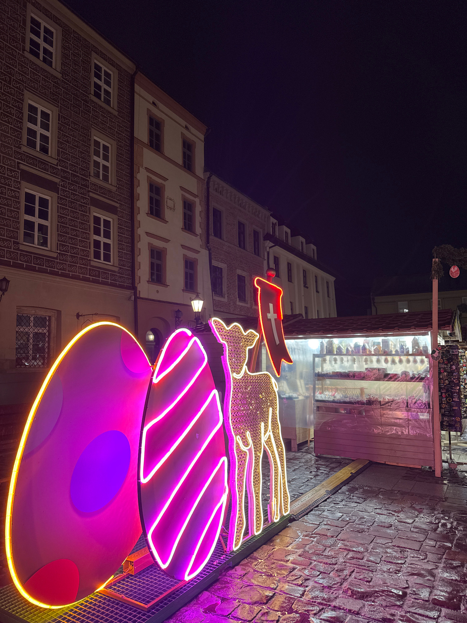The image shows a nighttime scene in Kraków, Poland, featuring prominent neon decorations. Two large, illuminated purple shapes are visible, resembling discs or candy with striped lighting on the uppe…read more