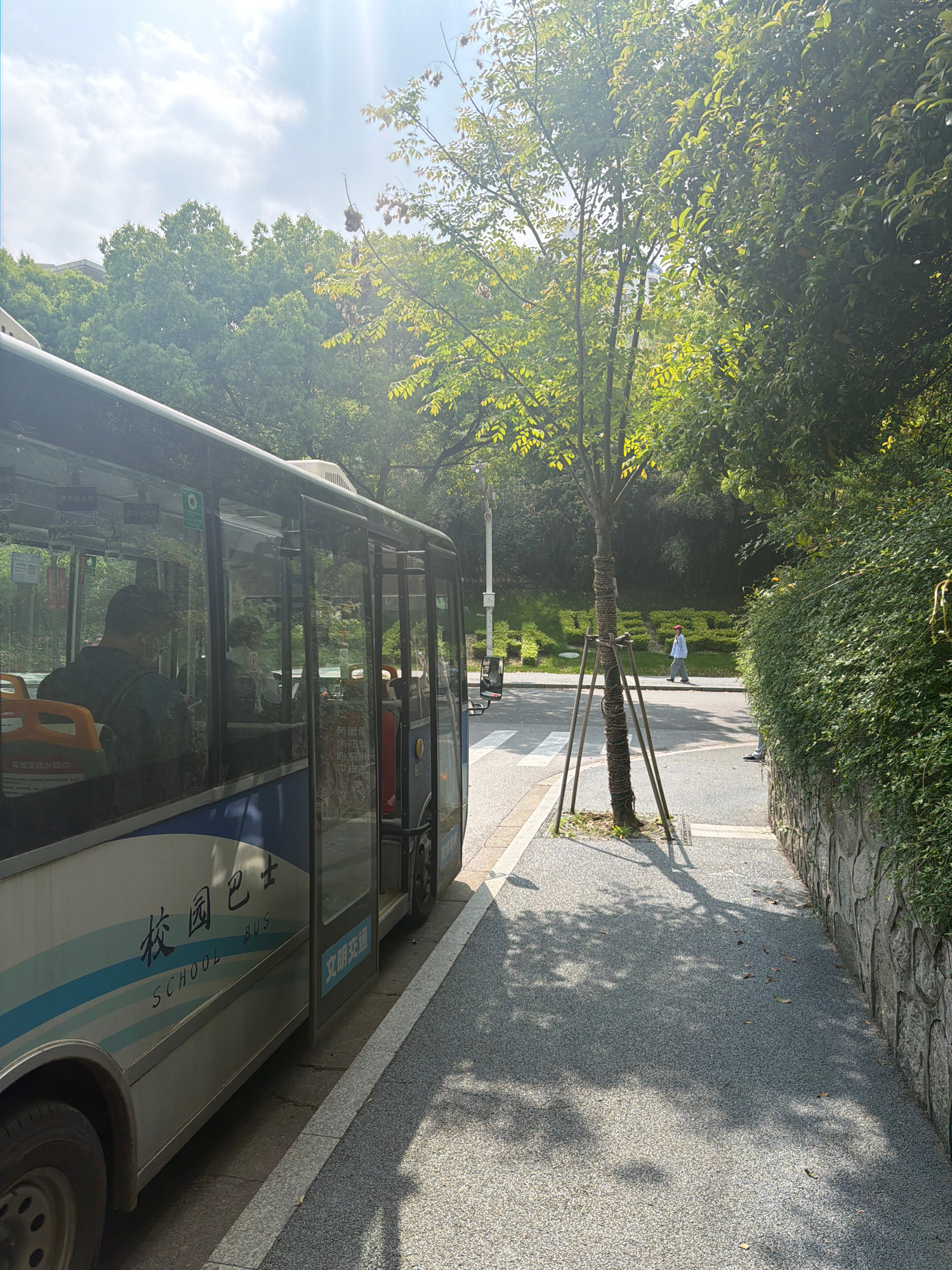 The image depicts a roadside scene in Jiangning District, China. A white and blue "School Bus" is parked on the right side of the street. Sunlight filters through the trees, casting shadows on the asp…read more