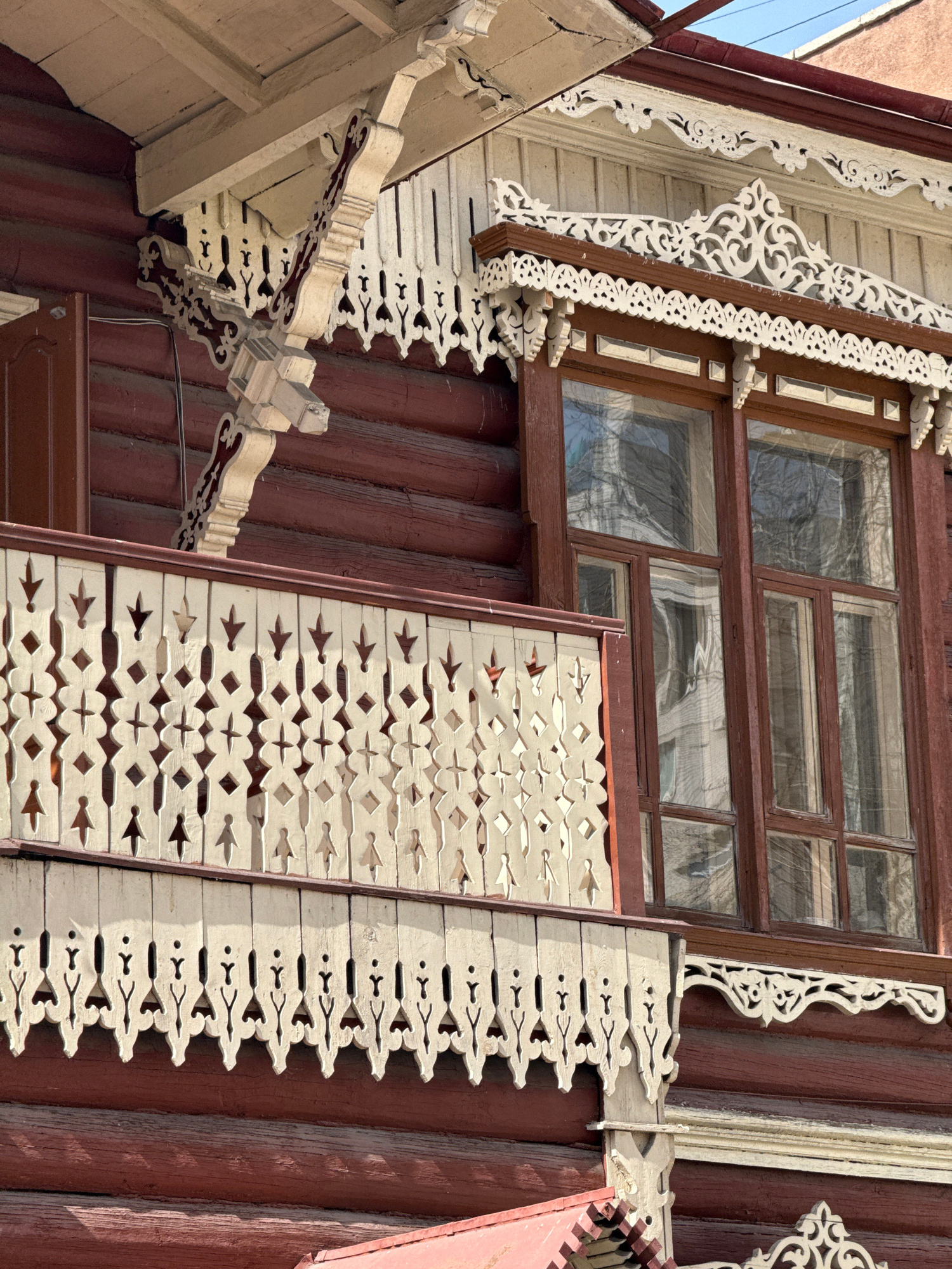 The image captures a close-up view of a section of an elaborately decorated wooden building in Chita, Russia. The building's exterior features rich, dark reddish-brown vertical wooden planks. An old,…read more