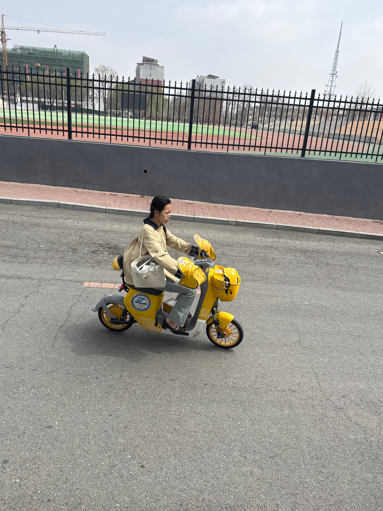 The image, taken in Zhongtun, China, depicts a young woman seated on a bright yellow electric scooter on an asphalt road. She is positioned towards the center-right, wearing a light-colored jacket, li…read more