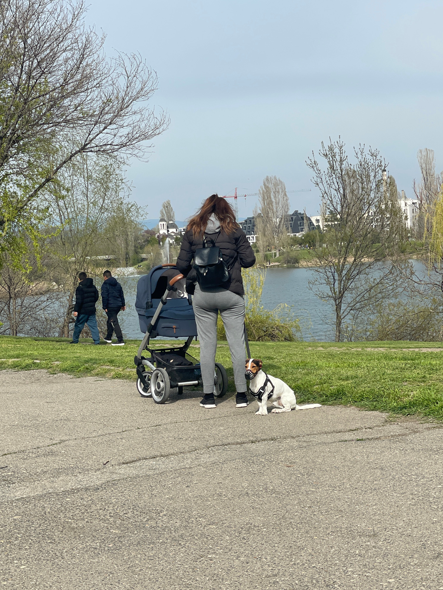 A woman is walking a dog while pushing a baby stroller on a paved path beside a river. The woman is wearing a black jacket, grey pants, a face mask, and a black backpack. The stroller is dark blue. Thβ¦read more