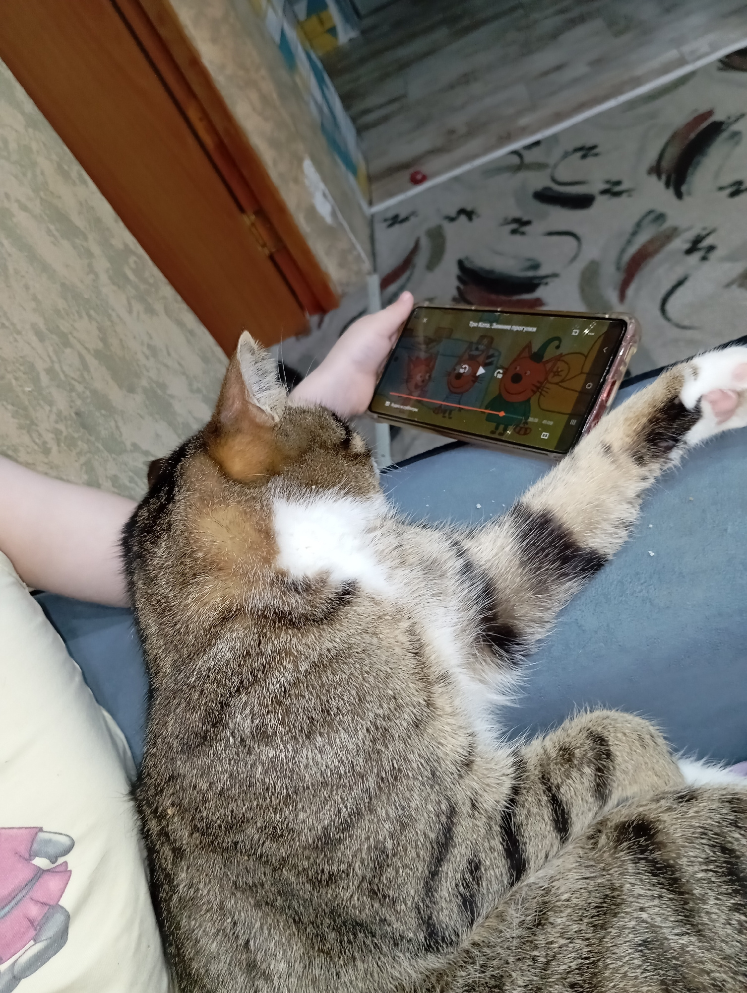 A domestic cat lies on its back, paws outstretched, atop a person's arm. The person holds a smartphone displaying a cartoon, "Three Cats. New episodes" in Russian. The scene is indoors, with textured…read more