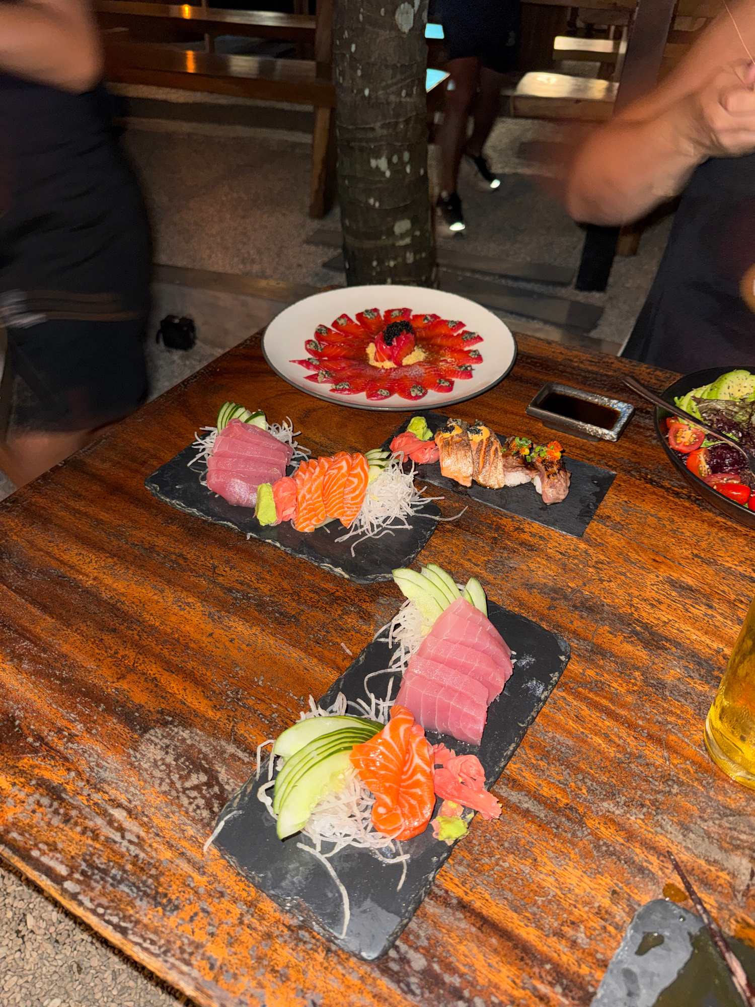 Captured from an overhead perspective, the image shows a diverse culinary spread on a weathered wooden table, possibly in an outdoor dining setting. Visible are plates of sushi and a salad, indicative…read more