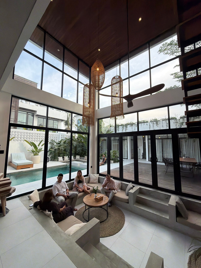 The image displays a modern, high-ceilinged living space within a residence located in the city of Unknown, Indonesia. The indoor area features a U-shaped, built-in concrete sunken lounge with light b…read more