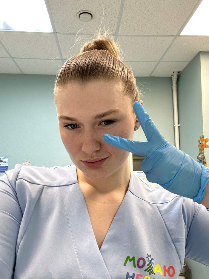 A young woman with blonde hair pulled back in a bun poses for a selfie. She wears light blue scrubs with colorful Cyrillic lettering on the right side. Her left hand, covered in a light blue glove, is…read more