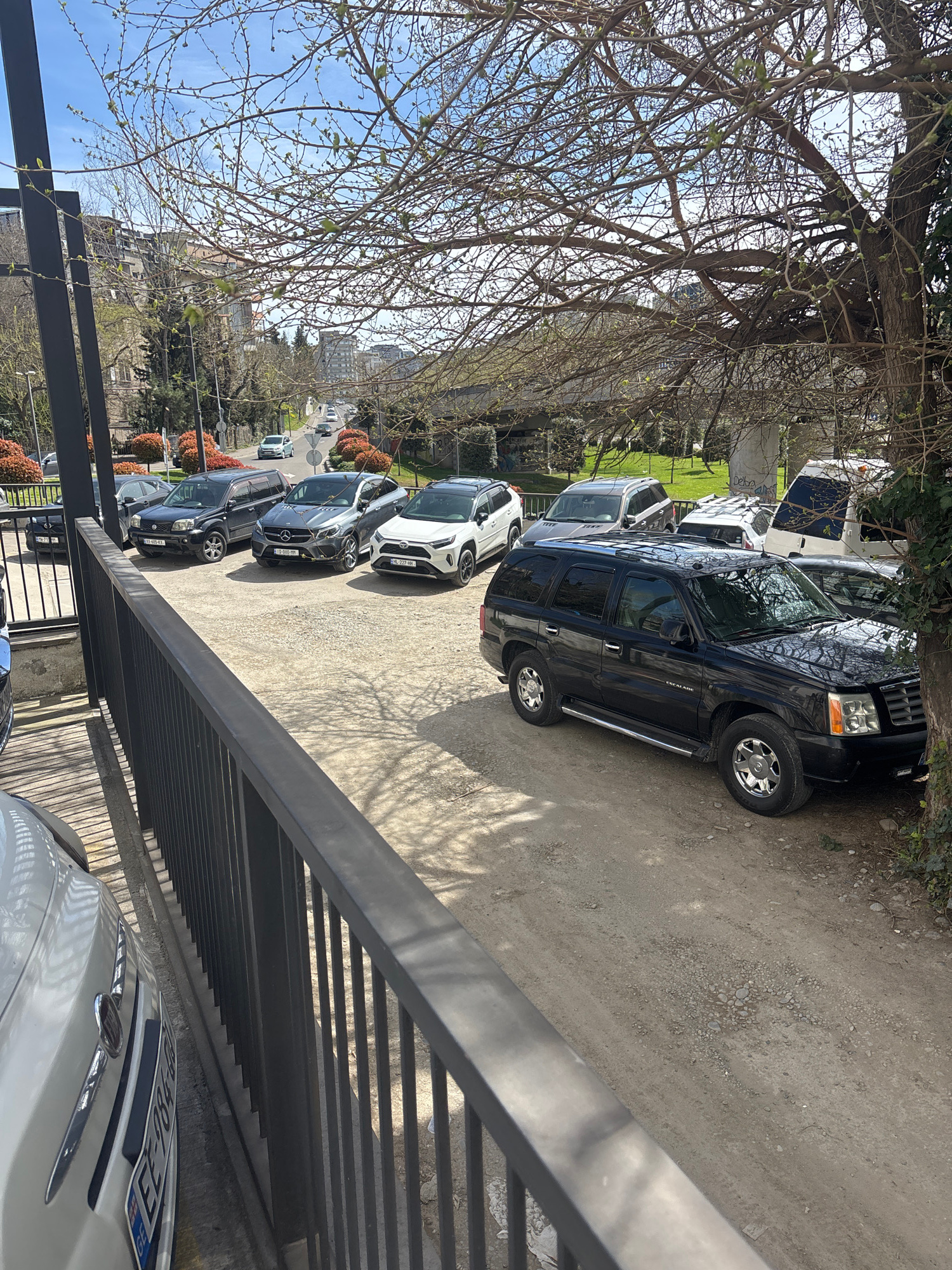 The image shows a row of parked cars in what appears to be a parking area in Tbilisi, Georgia. The cars are of various makes and models, including a black Cadillac Escalade. A metal fence is in the fo…read more