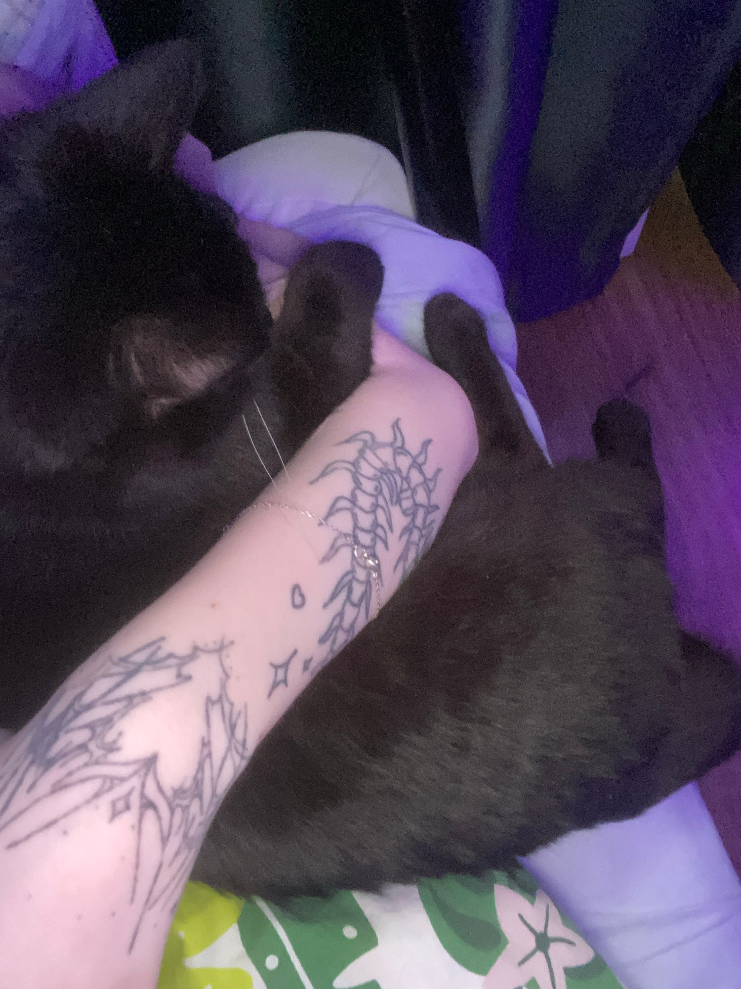 A person's arm, adorned with spiderweb and other geometric tattoos, rests on a black cat. Another black cat is partly visible in the lower left. The cats are lying on a pillow. The background includes…read more