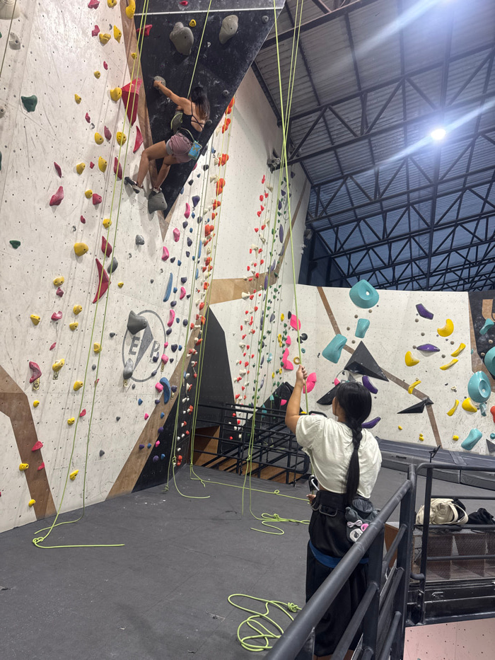 An indoor climbing gym scene at Easy Bouldering Club (EBC) in Bangkok, Thailand, features two females engaged in rock climbing activities. In the upper left quadrant, a female climber ascends a vertic…read more