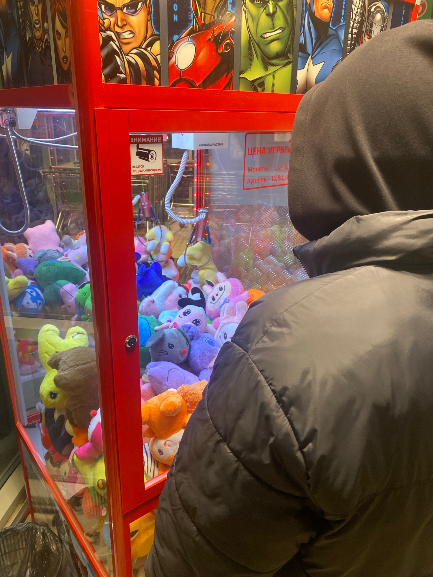 The image shows a claw crane machine filled with stuffed animals. The machine's casing is decorated with comic book character images. A person wearing a black jacket is standing at the machine. The ma…read more