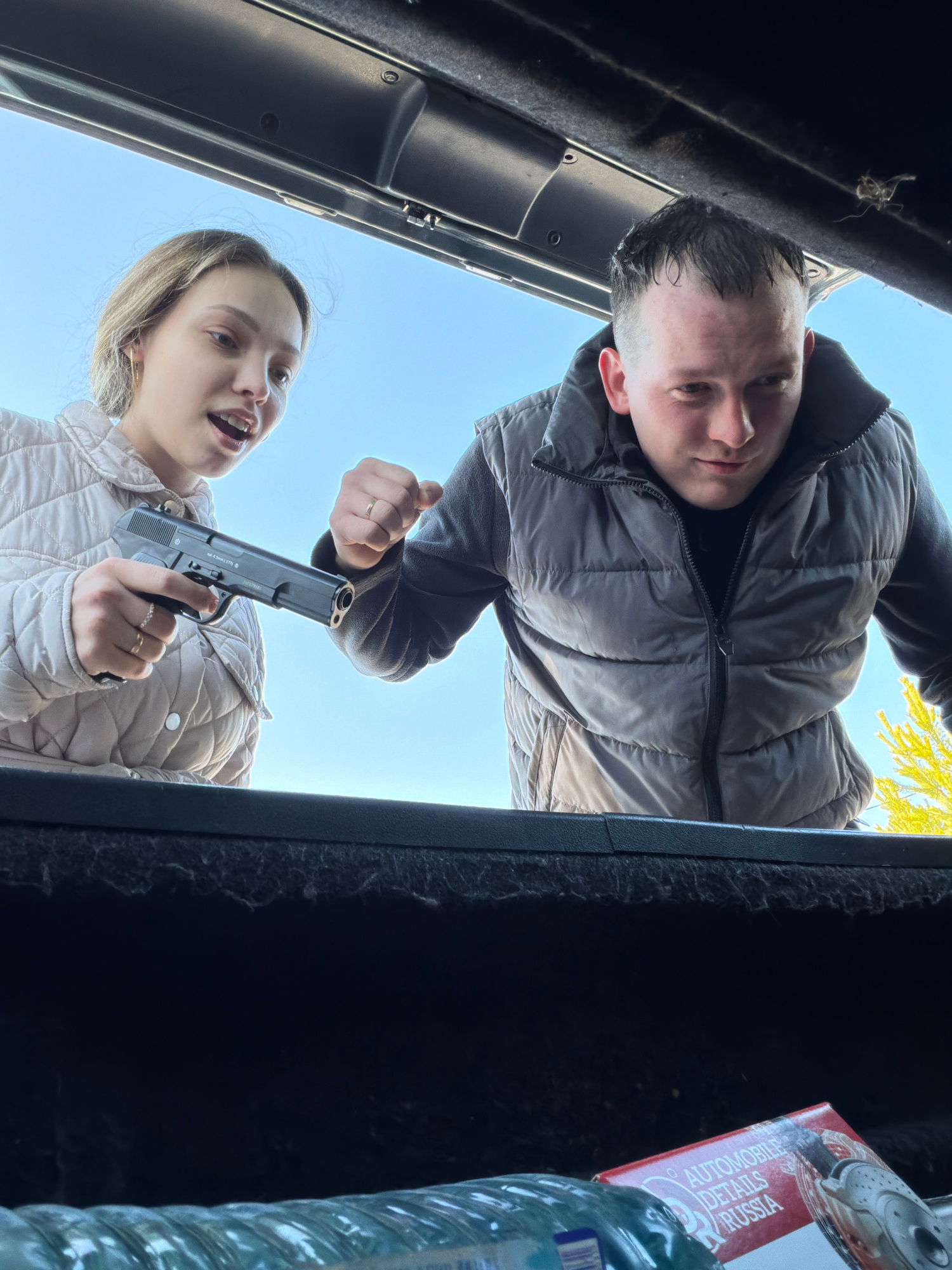 The image, taken from inside the trunk of a vehicle, shows two individuals. The first person, a young woman with light blond hair, is holding a black handgun. The second person, a man, is positioned a…read more