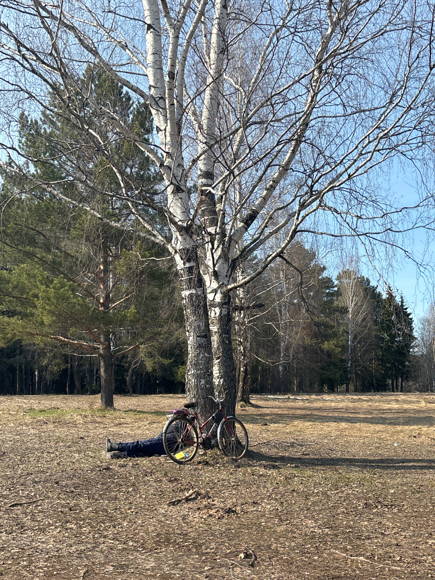 A horizontal image shows a person standing in a field holding a bicycle near a birch tree. The scene is likely in a park or wooded area in Chaikovsky, Russia. The person is wearing dark pants and sho…read more