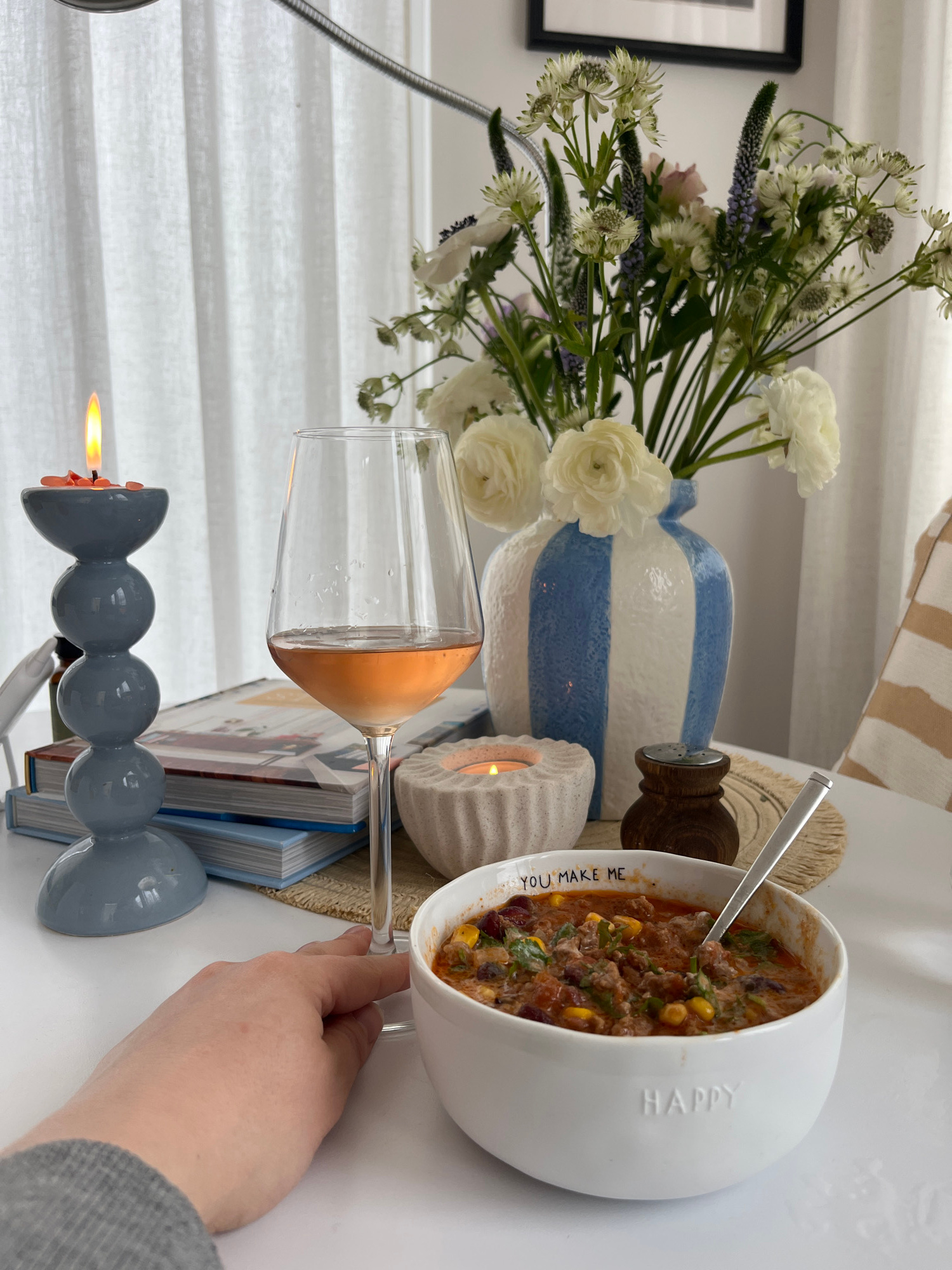 On a white surface, presumably a table, is an arranged vignette featuring a variety of objects. A floral arrangement in a blue and white striped vase takes center stage, accompanied by a white bowl fi…read more