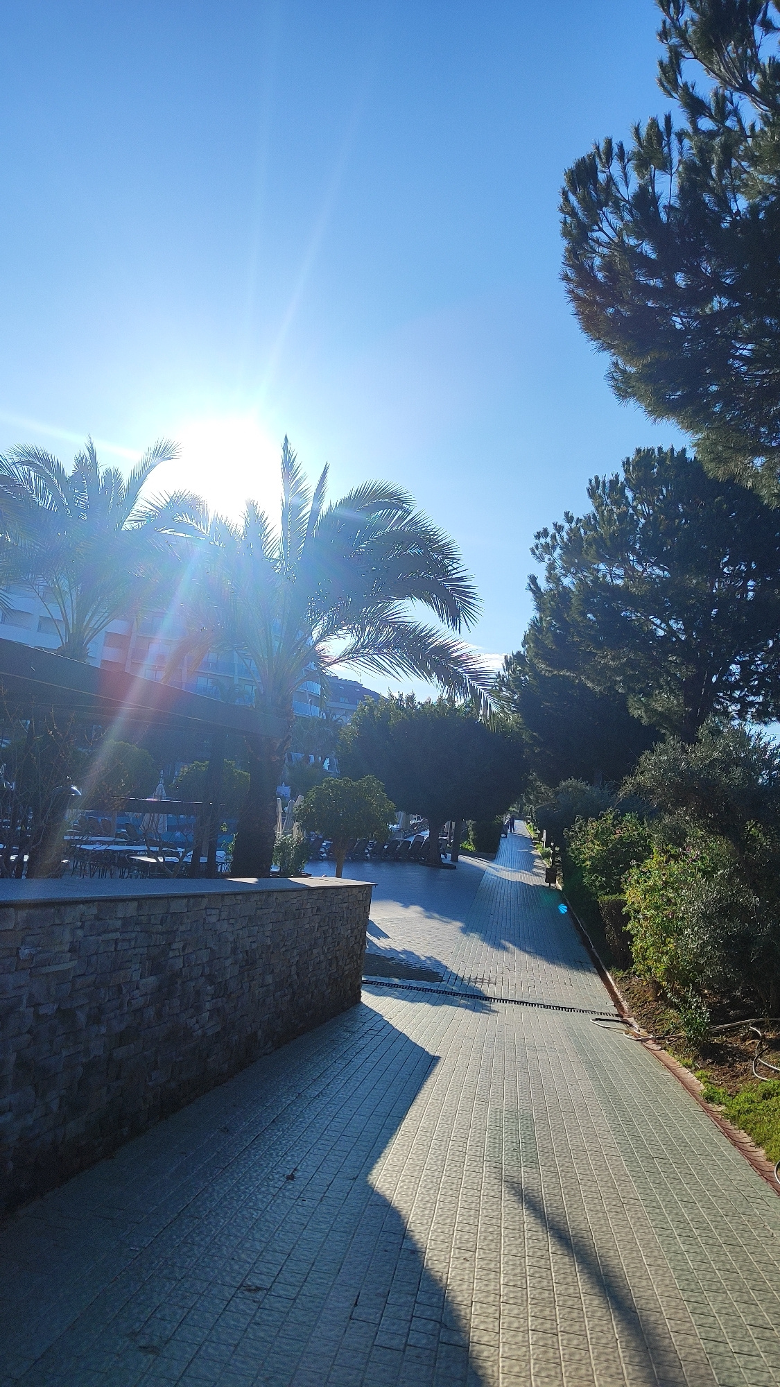 The image depicts an outdoor scene set in Alanya, Turkey, under a clear, bright blue sky with a prominent sun flare originating from the left. A low, stone-clad wall runs horizontally across the lower…read more