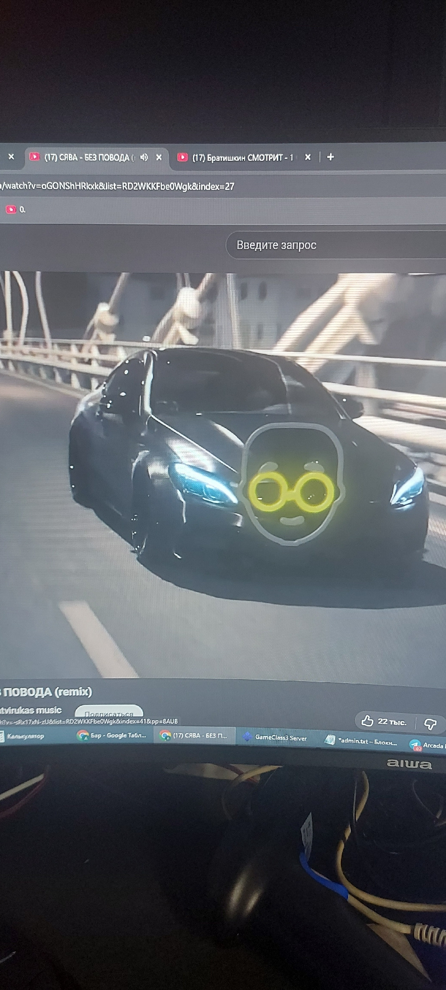 The image shows a computer monitor displaying a partially visible video of a black object with glowing yellow circles on it. Tabs at the top of the monitor show web pages, including YouTube videos wit…read more