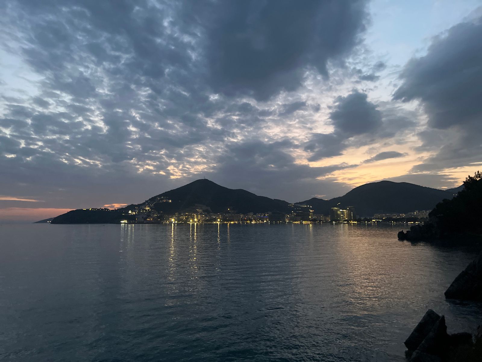 The image displays a serene coastal panorama captured during twilight, likely dusk, overlooking Boreti, Montenegro. The scene is dominated by a dynamic sky and a calm body of water reflecting the ligh…read more