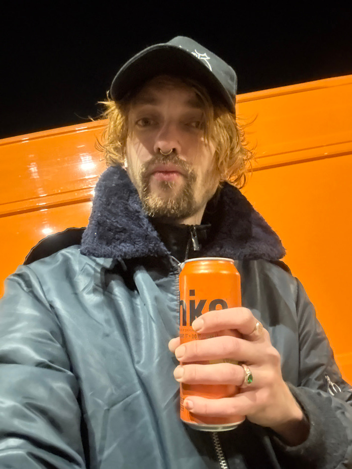 A person wearing a dark jacket with a fuzzy collar and a baseball cap holds an orange can labeled "liko." The person has long, wavy blond hair, a beard, and a ring in their nose. They are wearing ring…read more