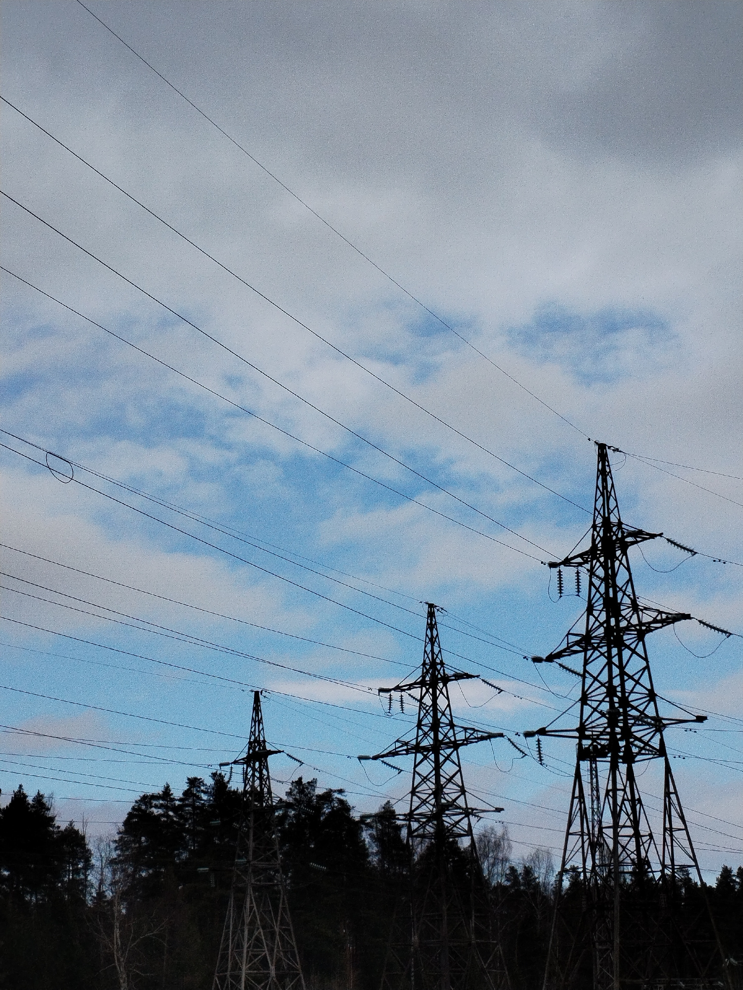 The image depicts three silhouetted electrical transmission towers against a cloudy sky. The towers are arranged in a line, receding into the distance. The nearest tower is the largest and most detail…read more