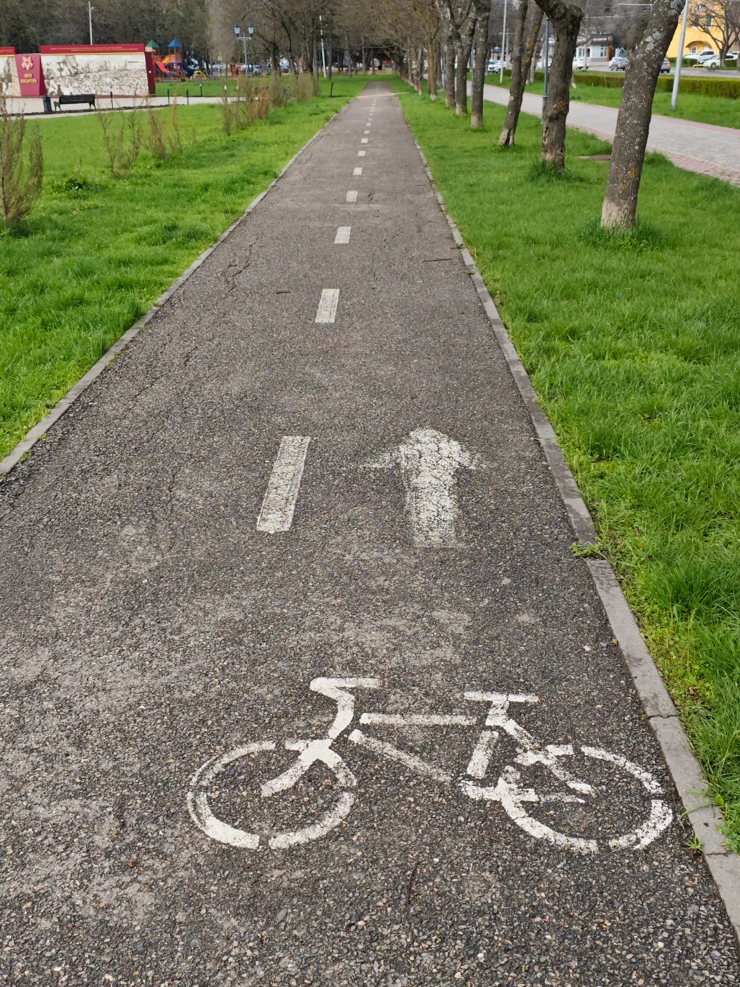 A ground-level, eye-level, medium shot depicts a paved bicycle path in what appears to be a park in Pyatigorsk, Russia. The path, made of dark asphalt, is marked with white paint indicating its use fo…read more