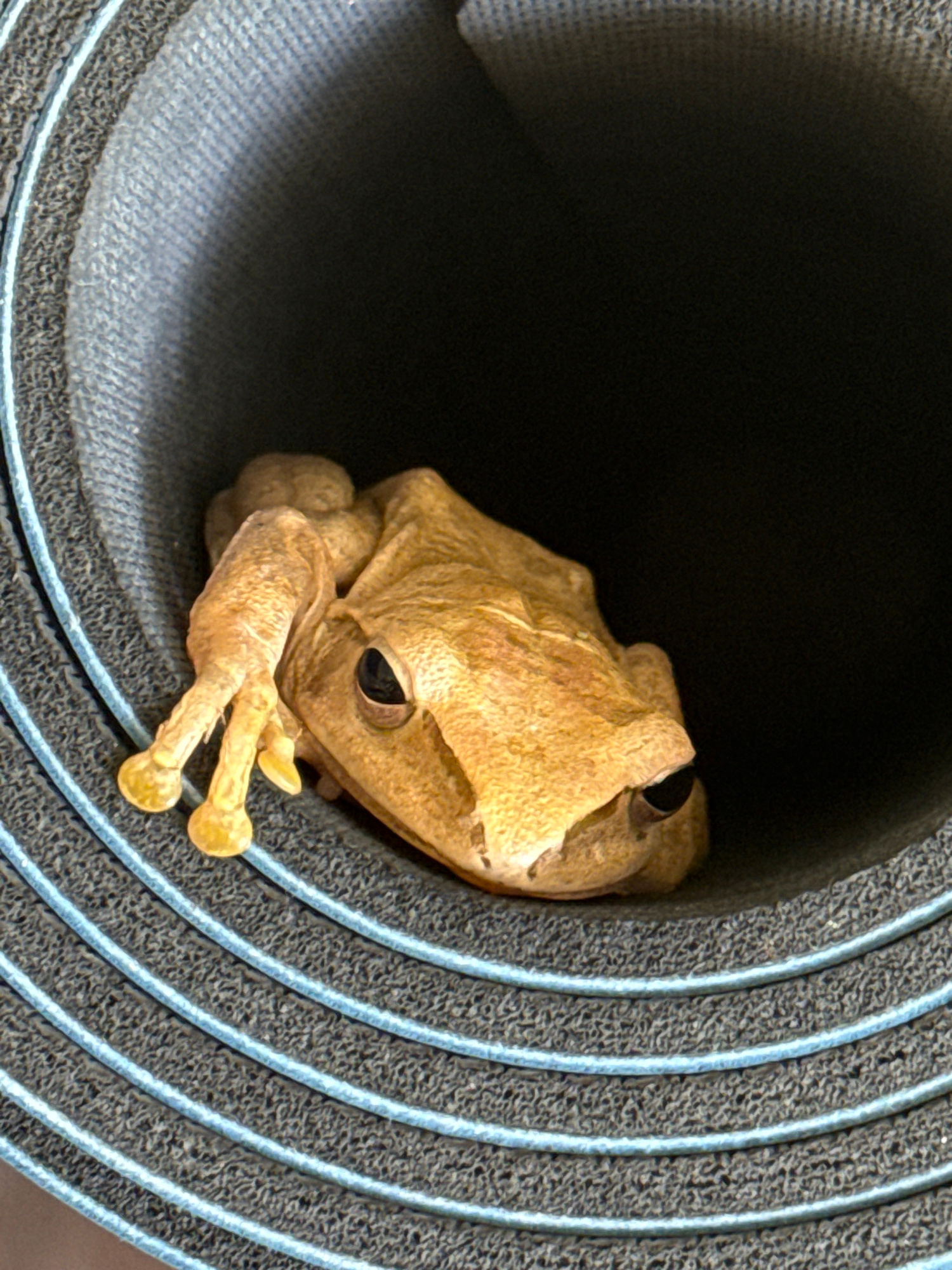 A tan frog sits inside a rolled-up yoga mat. The frog's front legs extend out, with two finger-like appendages visible. The mat is gray with thin blue lines running along the outside. The inside of th…read more