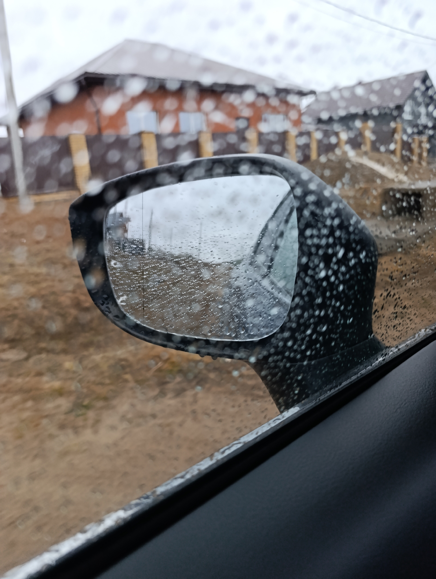 The image shows a car's side mirror covered in raindrops, reflecting a blurred view of a street in Chaikovsky, Russia. The mirror's frame is black, and the reflection shows a wet road and a house with…read more