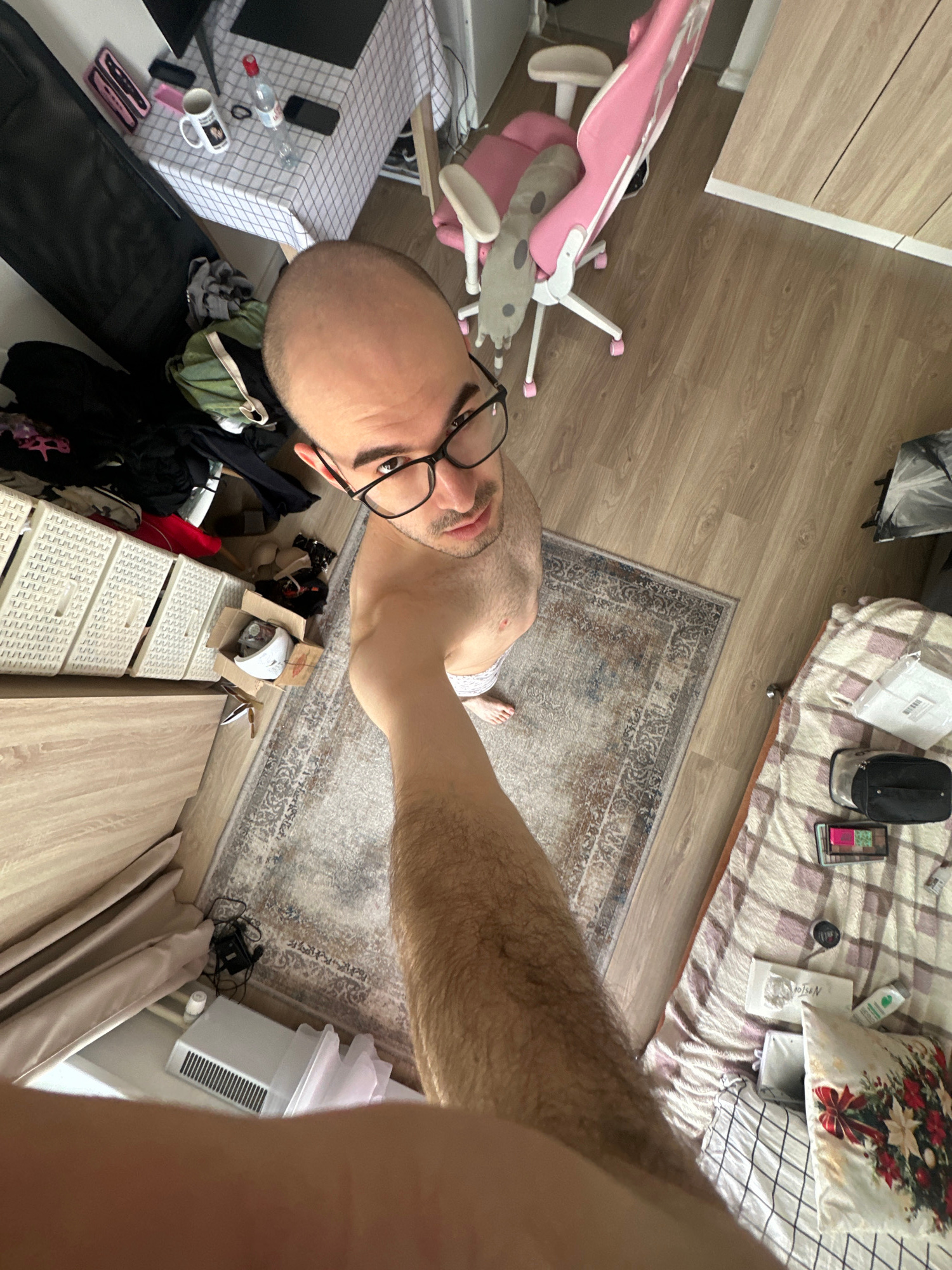 The image is a selfie taken from above, looking down at a bald, shirtless man with glasses. He appears to be standing in a cluttered room. The environment includes a bed with a patterned bedspread an…read more
