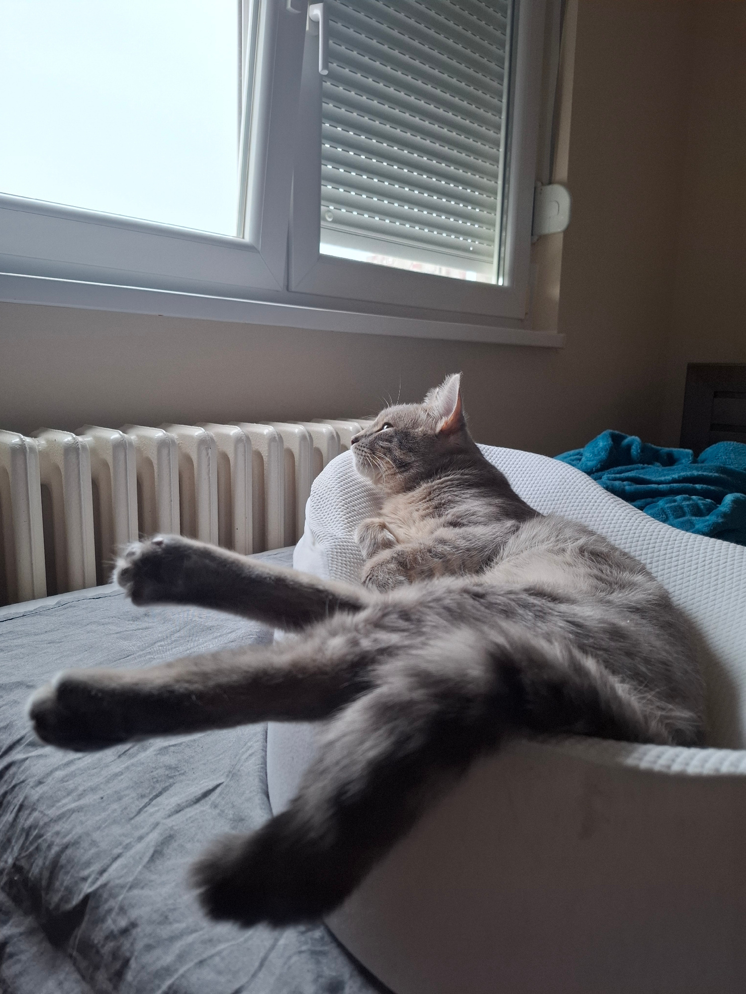 A grey cat lies partially inside a white cylindrical cat bed, with its legs dangling downward. The cat bed rests atop a white radiator positioned near a window with closed white blinds. The window is…read more