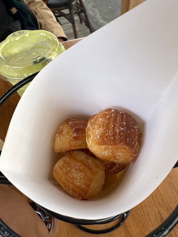 Four pretzel bites coated in coarse salt sit inside a white paper cone holder. The cone is held by a black wire rack on a wooden surface. Part of a clear plastic cup and a person's leg wearing brown s…read more