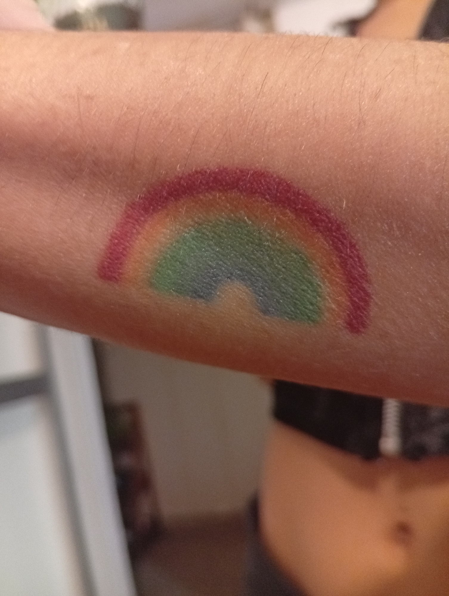 A close-up shot depicts a forearm with a rudimentary rainbow painted on the skin. The rainbow is semi-circular, comprising red, green, and blue hues. The skin is pale with fine hairs. In the backgroun…read more