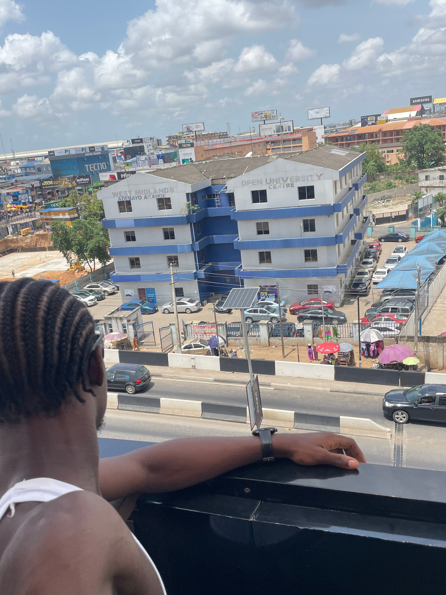 The image depicts a view from an elevated position, likely a building, overlooking an urban scene in Ikeja, Nigeria. The viewer's perspective includes a person, partially visible in the foreground, wi…read more